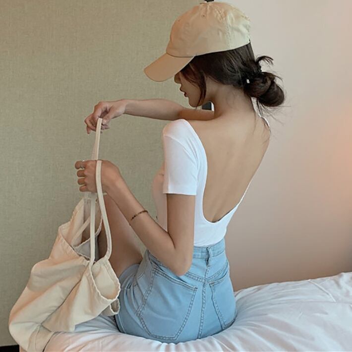 魅力的な背中開きデザインが印象的なショート丈Tシャツ。