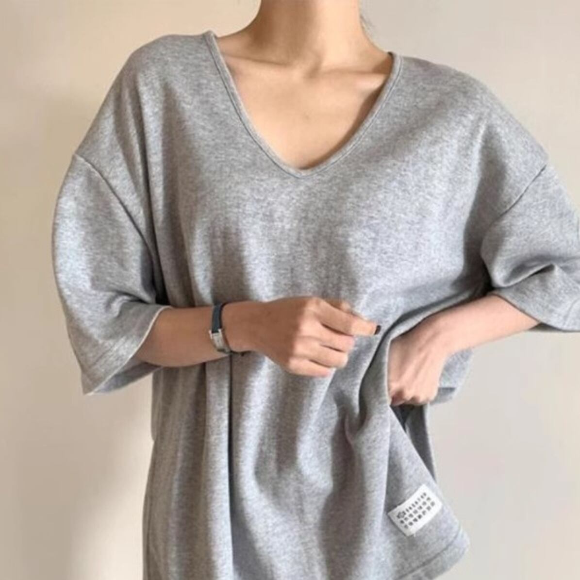 このVネックカットソーは、ミディアム丈で大人可愛い雰囲気を演出。