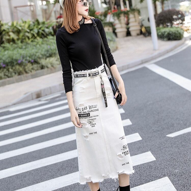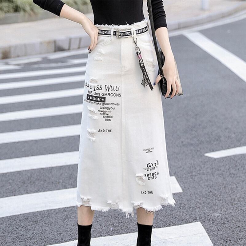 Aラインのシルエットが美しいラインを演出し、ダメージ加工が程よいカジュアルさをプラスしています。