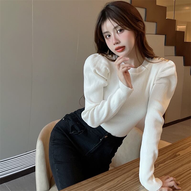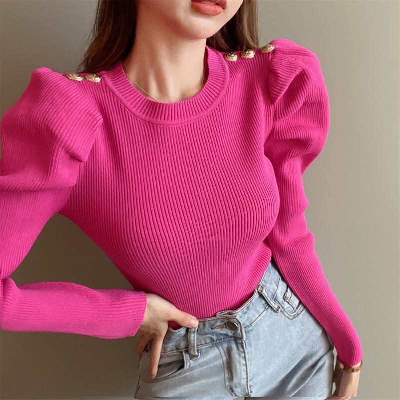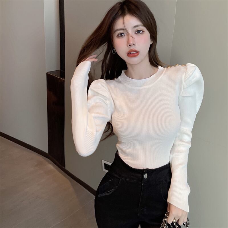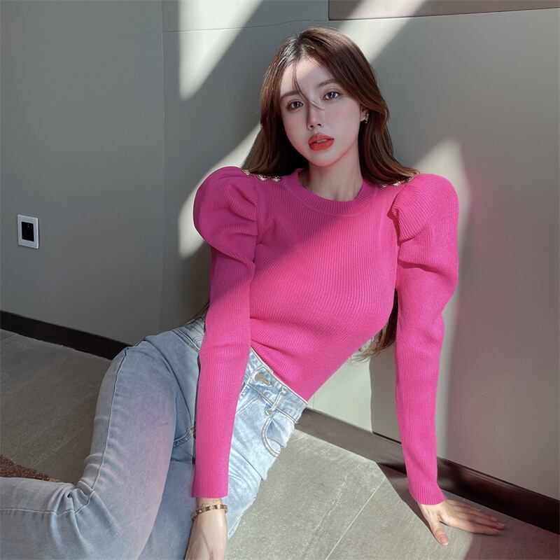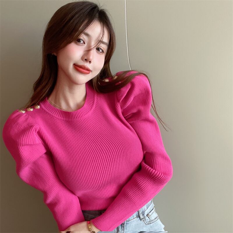 レディース トップス ニット セーター 長袖 パフスリーブ ラウンドネック スリム 細身 かわいい 大人可愛い きれいめ シンプル カジュアル 上品 おしゃれ レトロ こなれ感 ラフ ガーリー ラブリー キュート 無地 秋 冬 通勤 学生 学校 通学 デート お出かけ 女子会 ショッピング カフェ 韓国 コーデ 楽ちん 暖かい 体型カバー 普段使い 着回し モテ トレンド 流行 インスタ映え フリーサイズ ホワイト ブラック ピンク