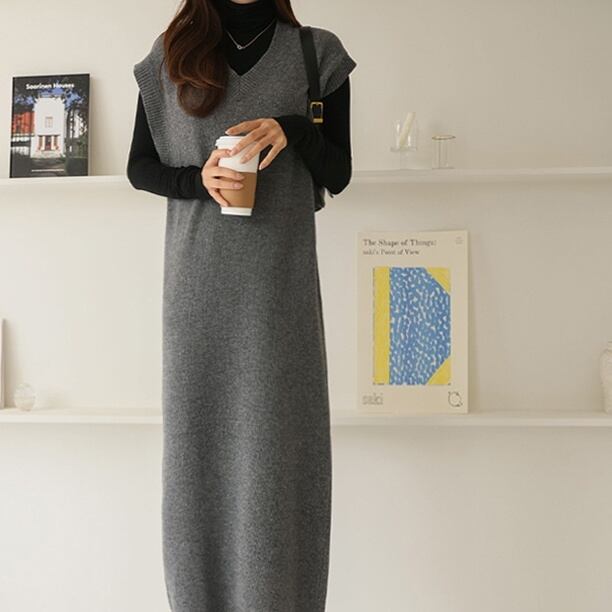 このVネック、ロング丈のノースリーブワンピースは、女性らしさを引き立てる一枚。