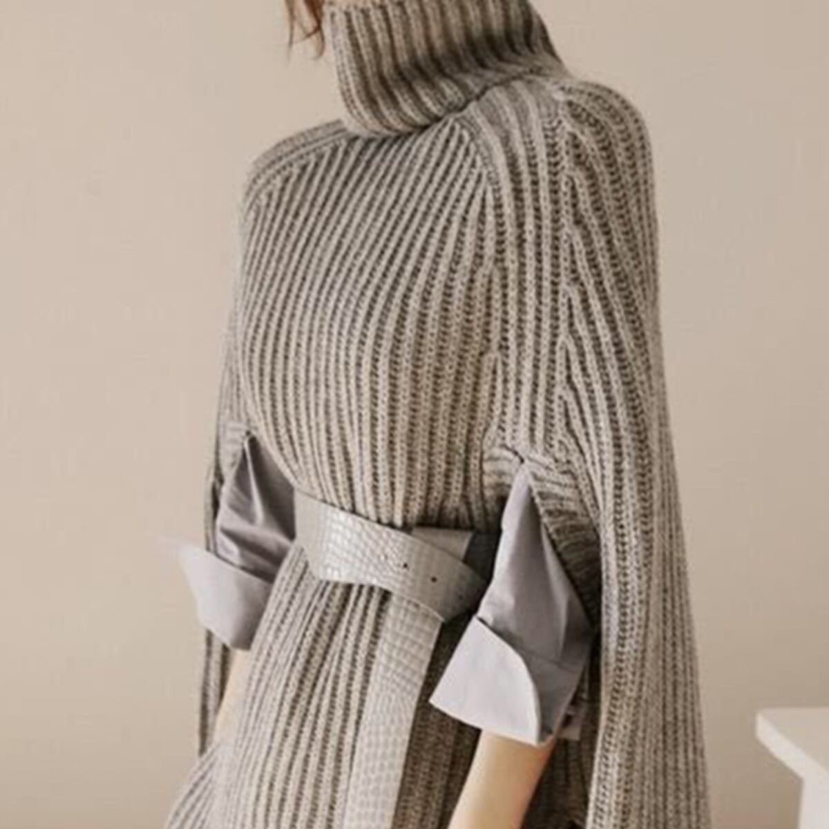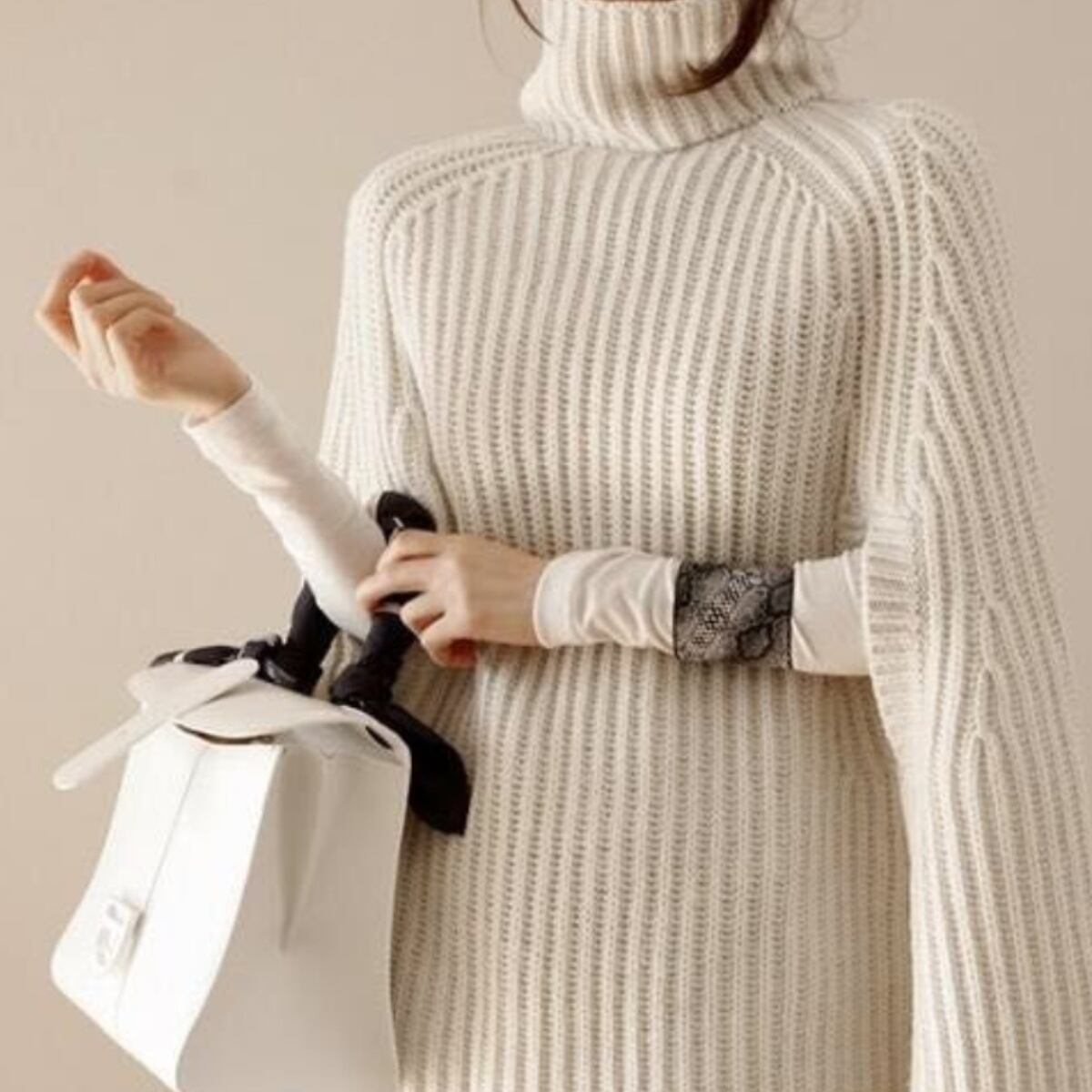 タートルネックのポンチョデザインは、一枚で主役級の存在感を放ちつつも、上品でおしゃれな雰囲気を漂わせます。