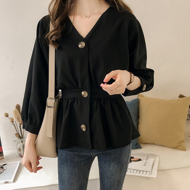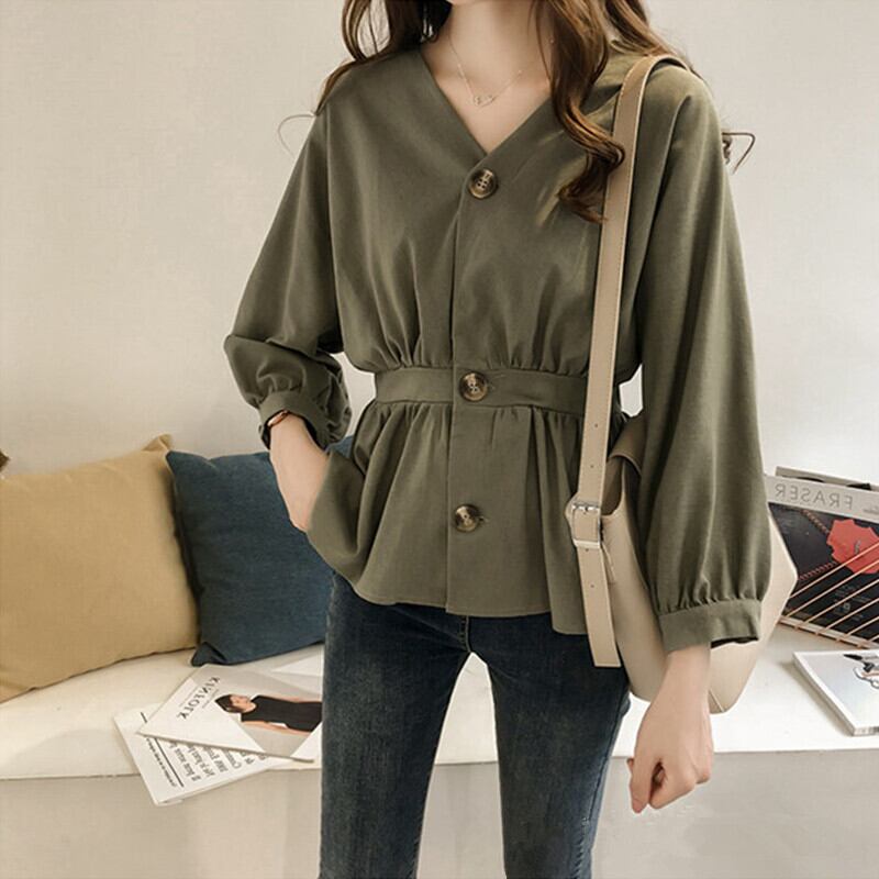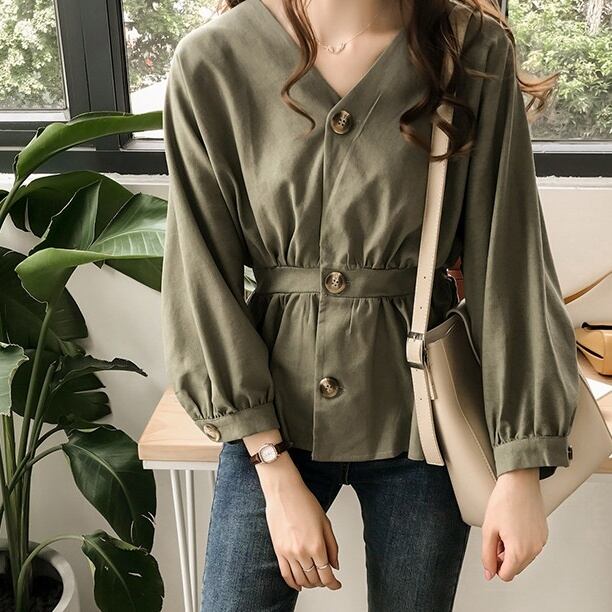 トップス シャツ ブラウス ミディアム丈 長袖 Vネック 前開き ボタン ウエストマーク かわいい 大人可愛い きれいめ シンプル 上品 おしゃれ かっこいい レトロ こなれ感 個性的 主役級 存在感 抜け感 オールシーズン ナチュラル ベーシック キュート クール メンズライク 無地 レディース 女性用 ママ OL 通勤 オフィス 学生 通学 デート お出かけ お泊まり イベント 女子会 休日 カフェ ショッピング レストラン コンパ レイヤード 重ね着 普段使い 着回し M L XL 2XL