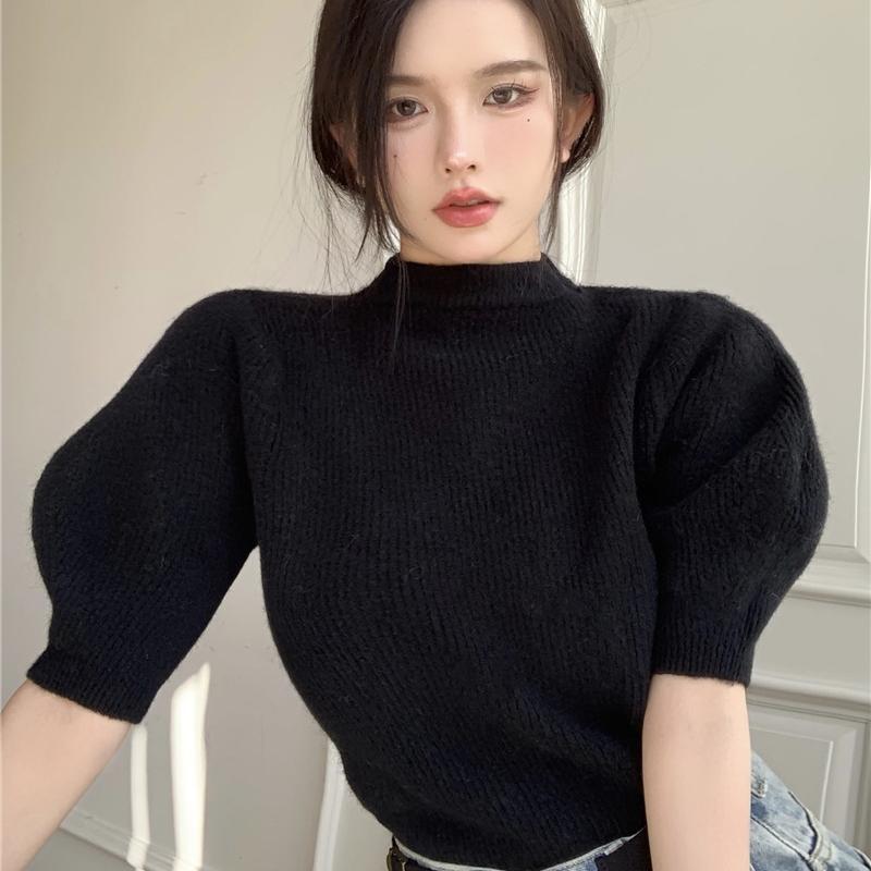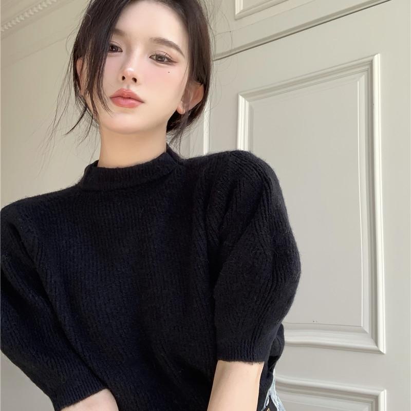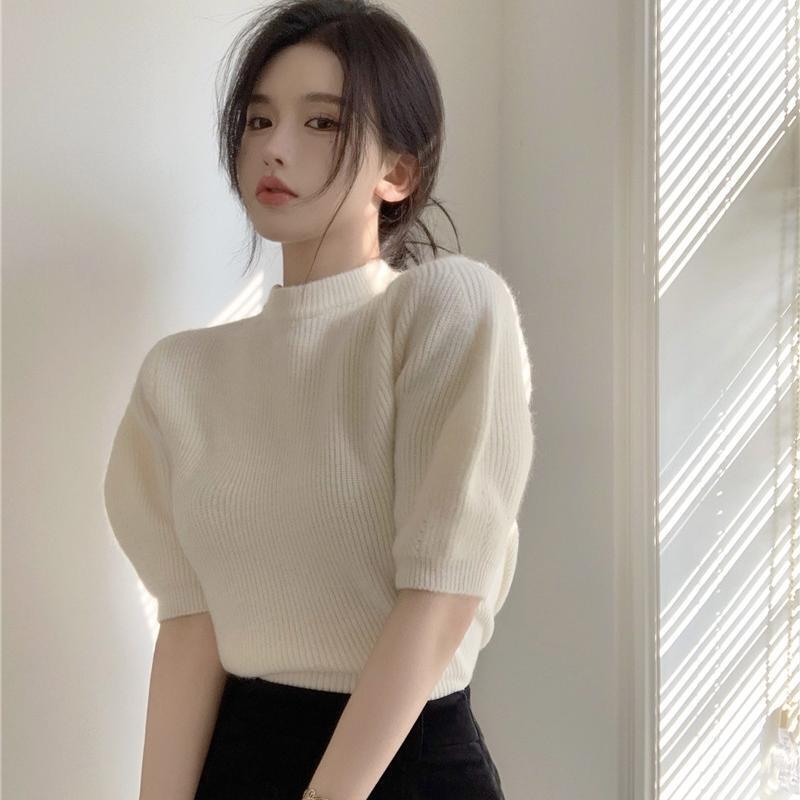 トップス ニットソー プルオーバー ミディアム丈 半袖 パフスリーブ ハイネック かわいい 大人可愛い きれいめ シンプル 上品 おしゃれ かっこいい レトロ ラフ ルーズ こなれ感 個性的 主役級 存在感 抜け感 春 秋 冬 キュート ナチュラル ベーシック レディース ガーリー 清楚 女性用 ママ OL 通勤 オフィス 学生 通学 デート お出かけ お泊まり イベント 女子会 休日 アウトドア カフェ ショッピング レストラン コンパ レイヤード 重ね着 普段使い 着回し S M L 暖かい