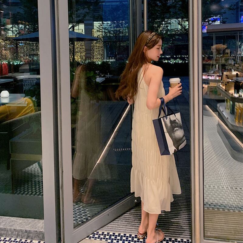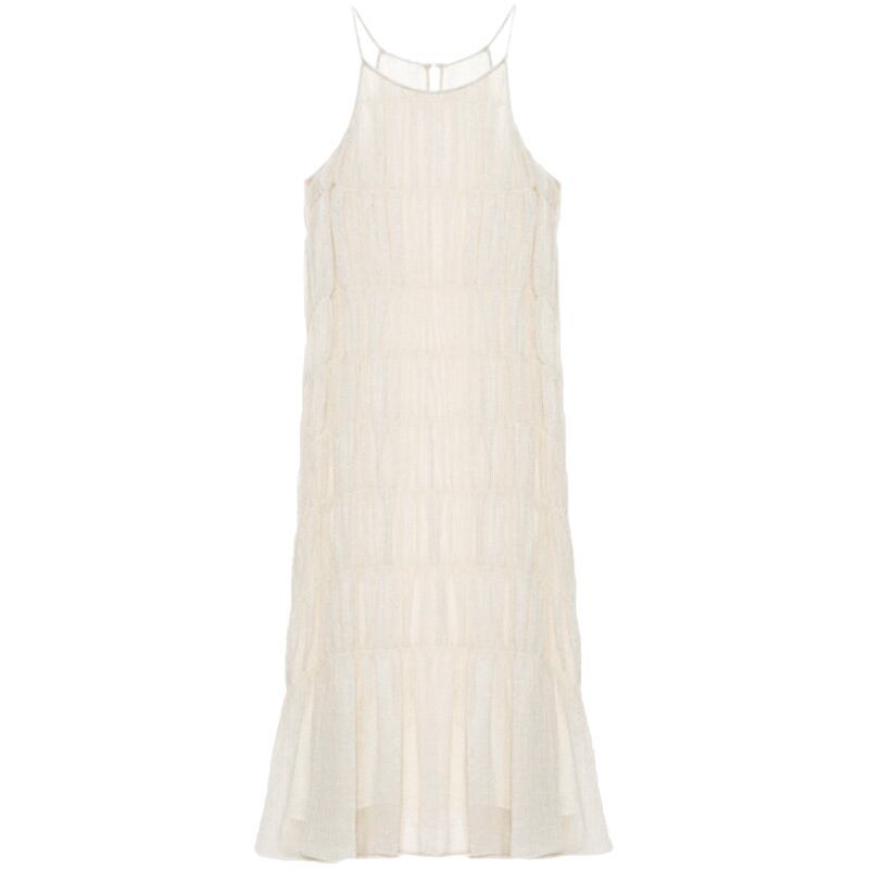 軽やかな素材感と女性らしいシルエットが魅力のキャミソールワンピース、ミモレ丈。