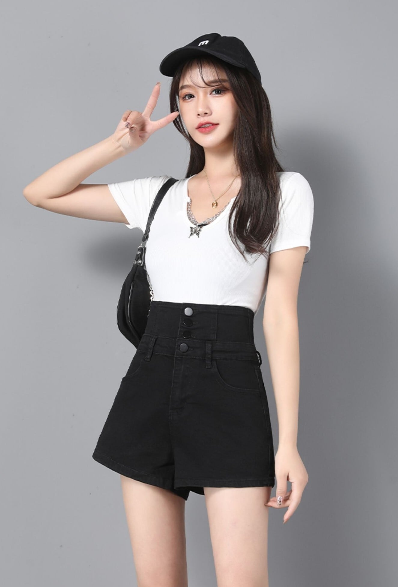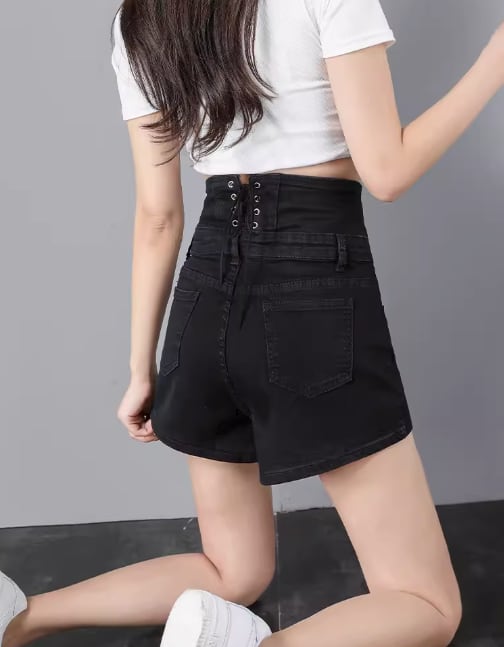 バックの編み上げたリボンがキュートな、ハイウエストデニムショートパンツ。