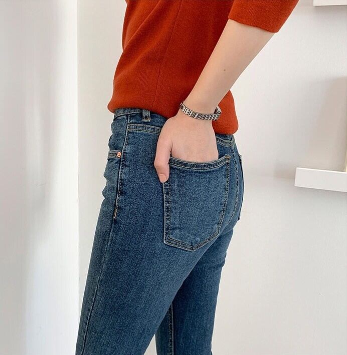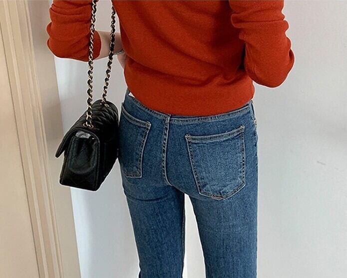 高めのウエストラインで腰回りもすっきりとし、デニム地はストレッチ性があり、動きやすくなっています。