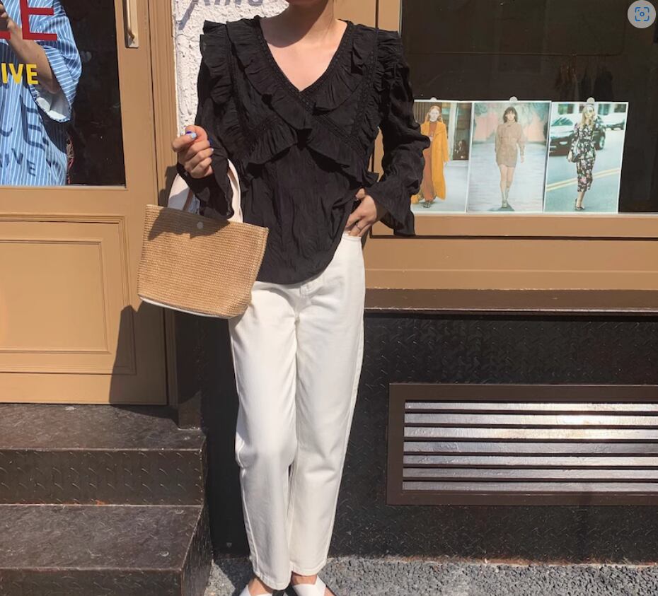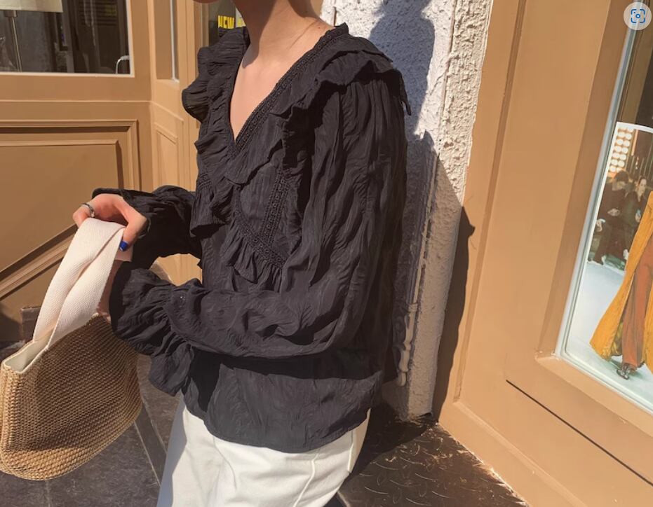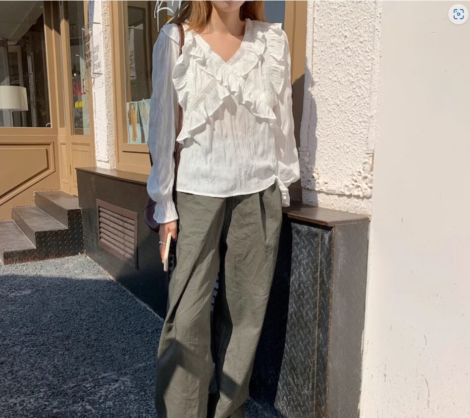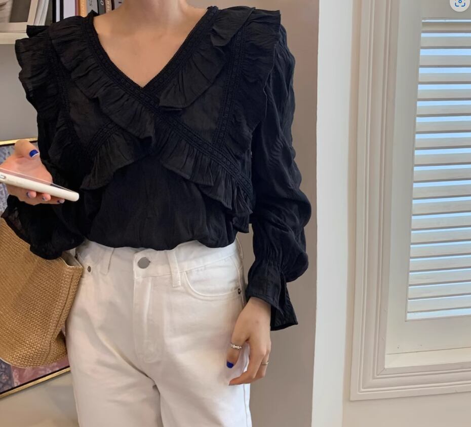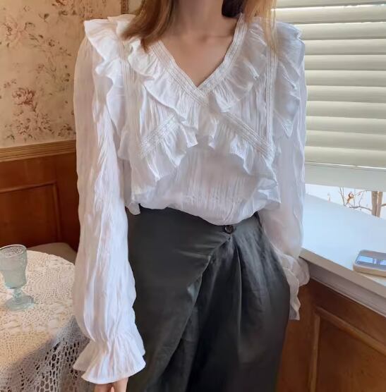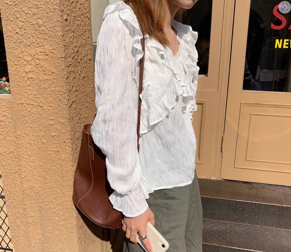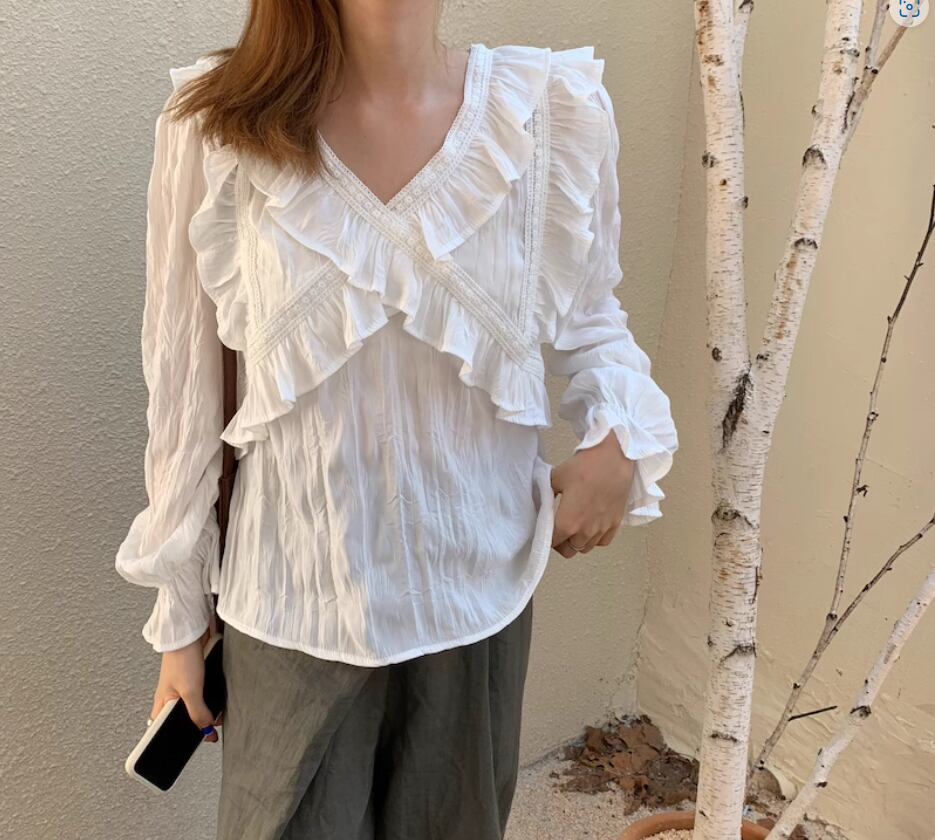 クロスデザインフリル&レースブラウス トップス 白トップス 袖あり 長袖 ボリューム袖 袖コンシャス Vネック ストレート 透け感 薄手 かわいい 大人可愛い カジュアル おしゃれ お洒落 こなれ感 無地 春 夏 10代 20代 30代 40代 レディース 女性用 お出かけ 休日 着回し 普段使い S M L 白 ホワイト 黒 ブラック