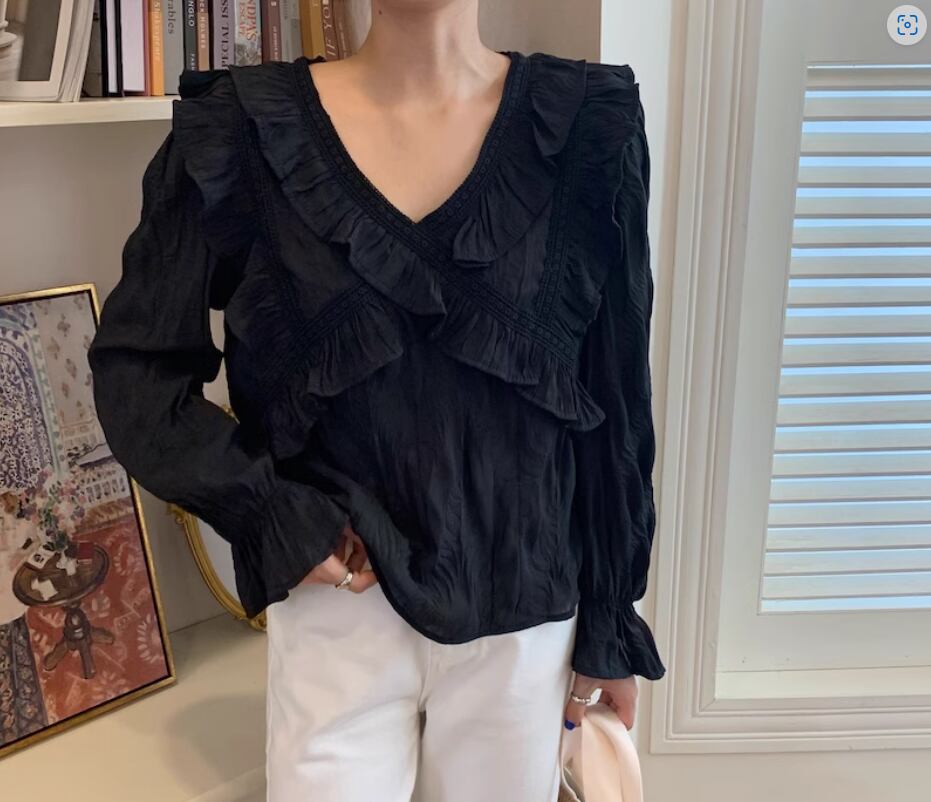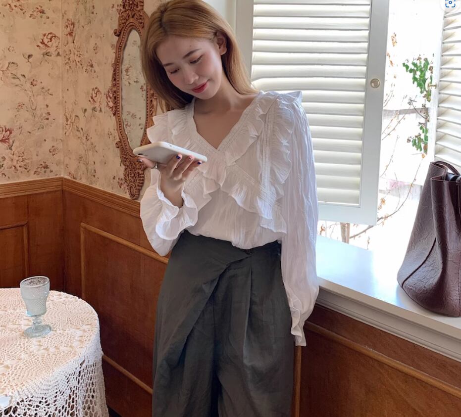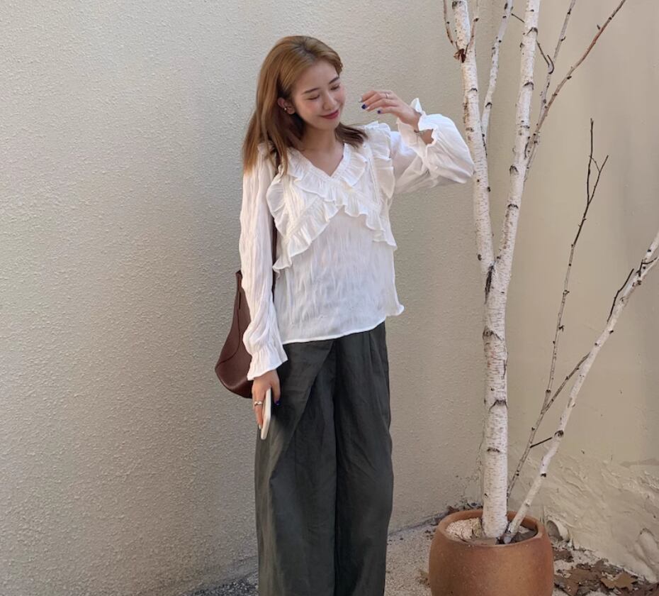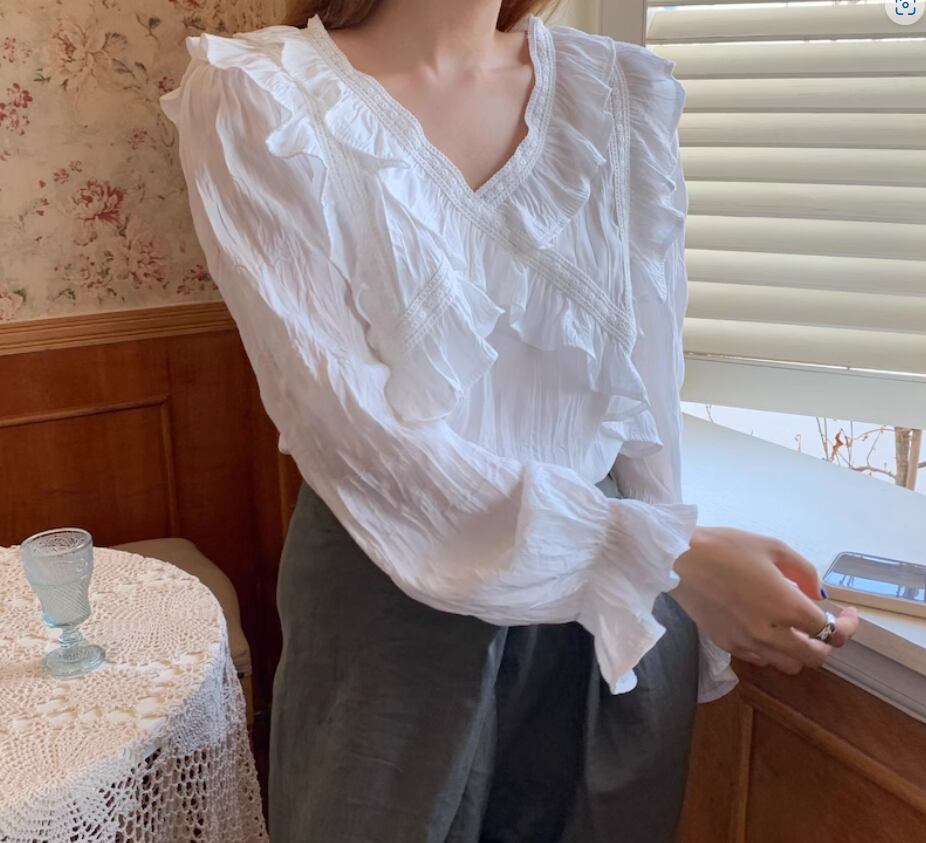 クロスデザインのフリルとレースが大人可愛い長袖ブラウス
