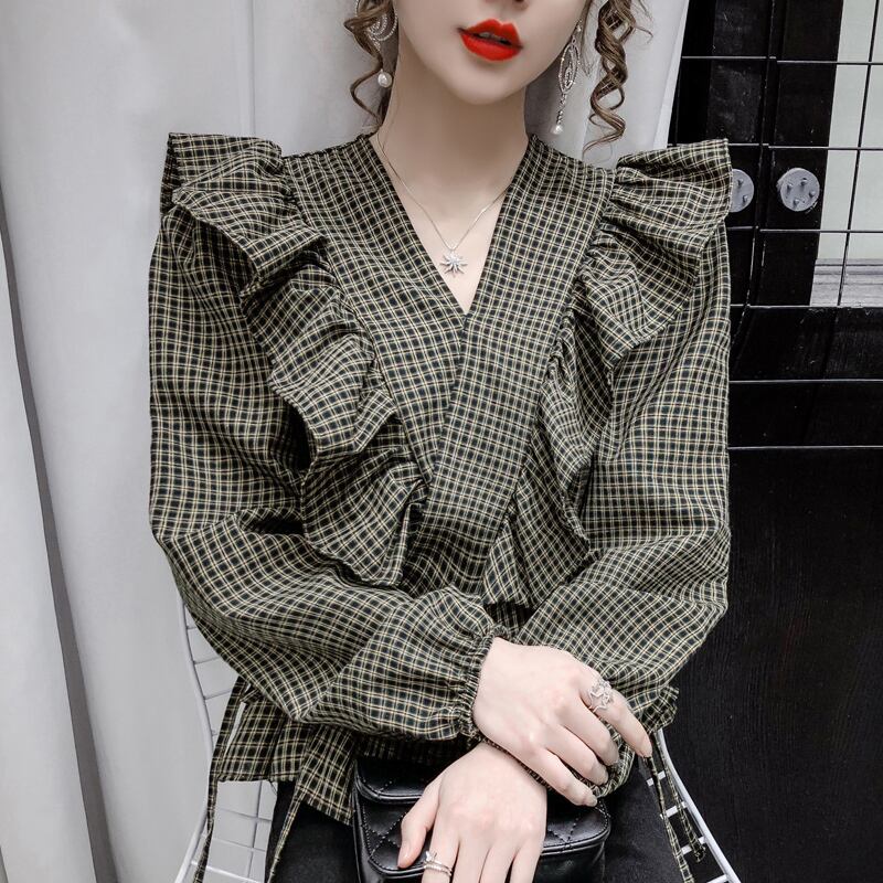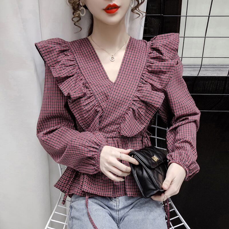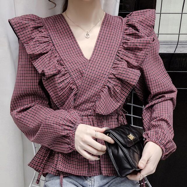 トップス ブラウス プルオーバー ショート丈 長袖 Vネック フリル ウエストマーク かわいい 大人可愛い きれいめ シンプル 上品 おしゃれ かっこいい レトロ こなれ感 個性的 主役級 存在感 抜け感 春 夏 秋 ナチュラル ベーシック キュート ガーリー メンズライク チェック柄 レディース 女性用 ママ OL 通勤 オフィス 学生 通学 デート お出かけ お泊まり イベント 女子会 休日 アウトドア カフェ ショッピング レストラン コンパ レイヤード 重ね着 普段使い 着回し S M L XL