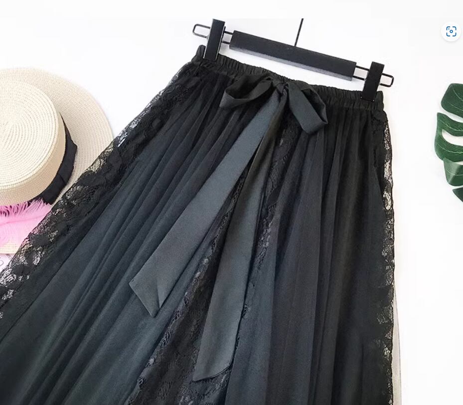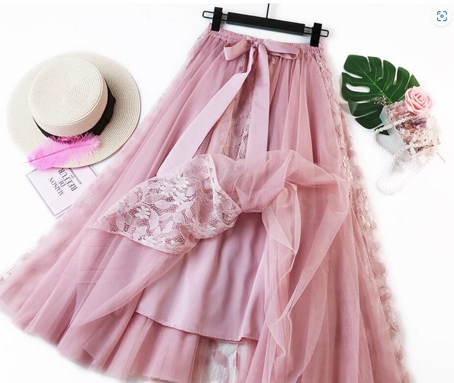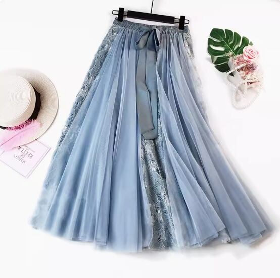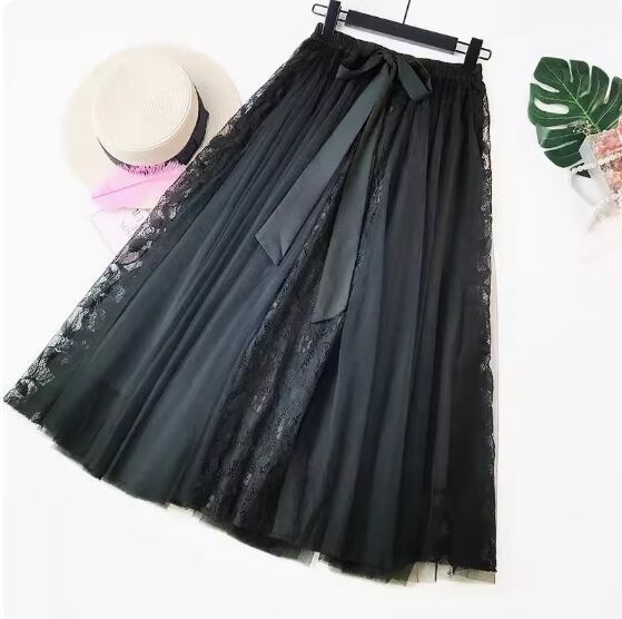 レース×レーススカート ミディアム丈 Aライン リボン ふわふわ ハイウエスト ウエストゴム 透け感 伸縮性 ポリエステル かわいい 大人可愛い 上品 おしゃれ お洒落 ガーリー 存在感 無地 春 夏 秋 10代 20代 30代 レディース 女性用 デート お出かけ 休日 着回し 普段使い 楽ちん モテ フリーサイズ 黒 ブラック 青 ブルー ピンク アプリコット