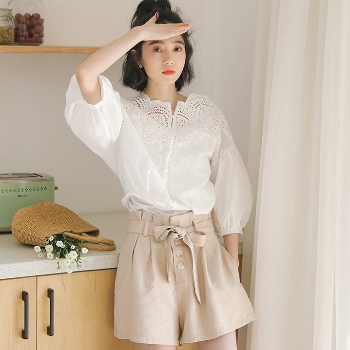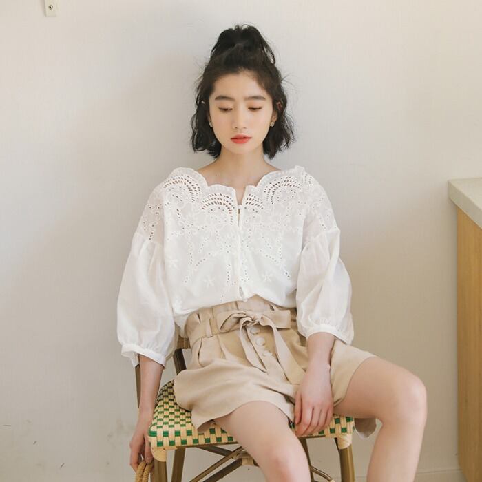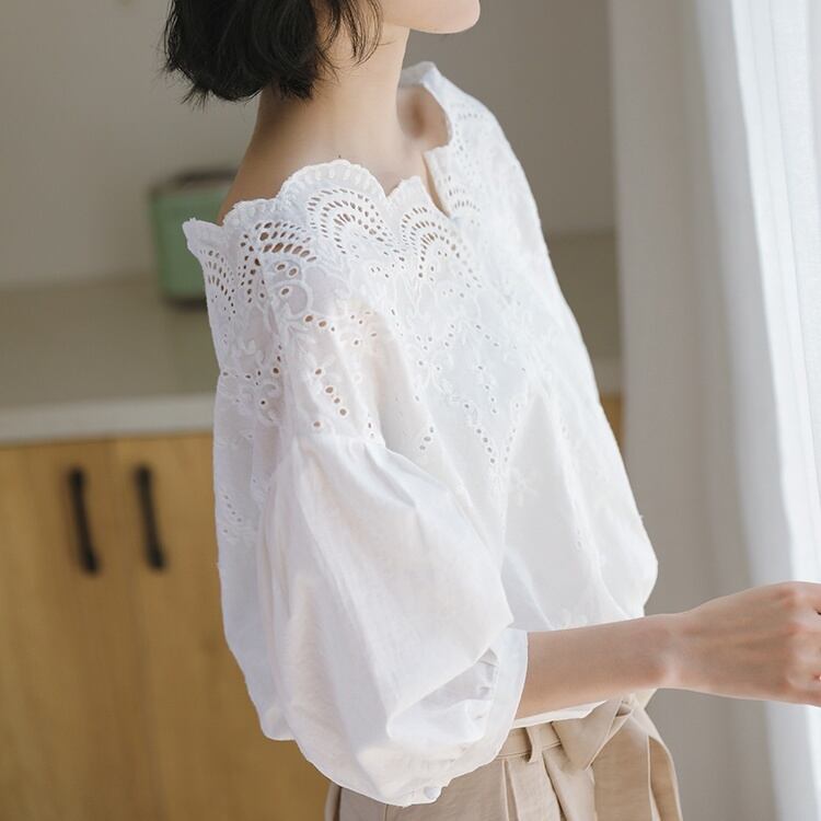 トップス ブラウス ミディアム丈 プルオーバー 7分袖 ボリューム袖 刺繡 透け感 かわいい 大人可愛い きれいめ シンプル 上品 おしゃれ かっこいい レトロ きちんと こなれ感 個性的 主役級 存在感 抜け感 オールシーズン ナチュラル ベーシック キュート ガーリー メンズライク 無地 レディース 女性用 ママ OL 通勤 オフィス 学生 通学 デート お出かけ お泊まり イベント 女子会 休日 アウトドア カフェ ショッピング レストラン コンパ レイヤード 重ね着 普段使い 着回し S M L
