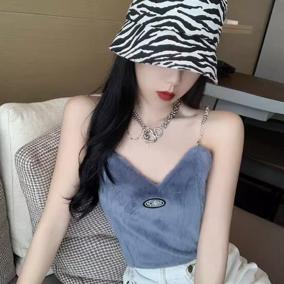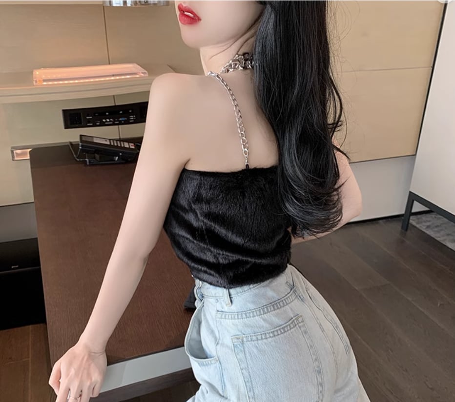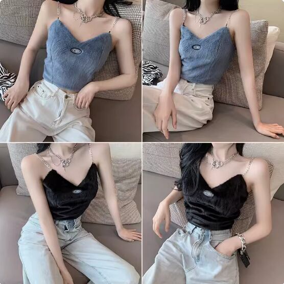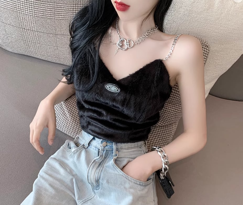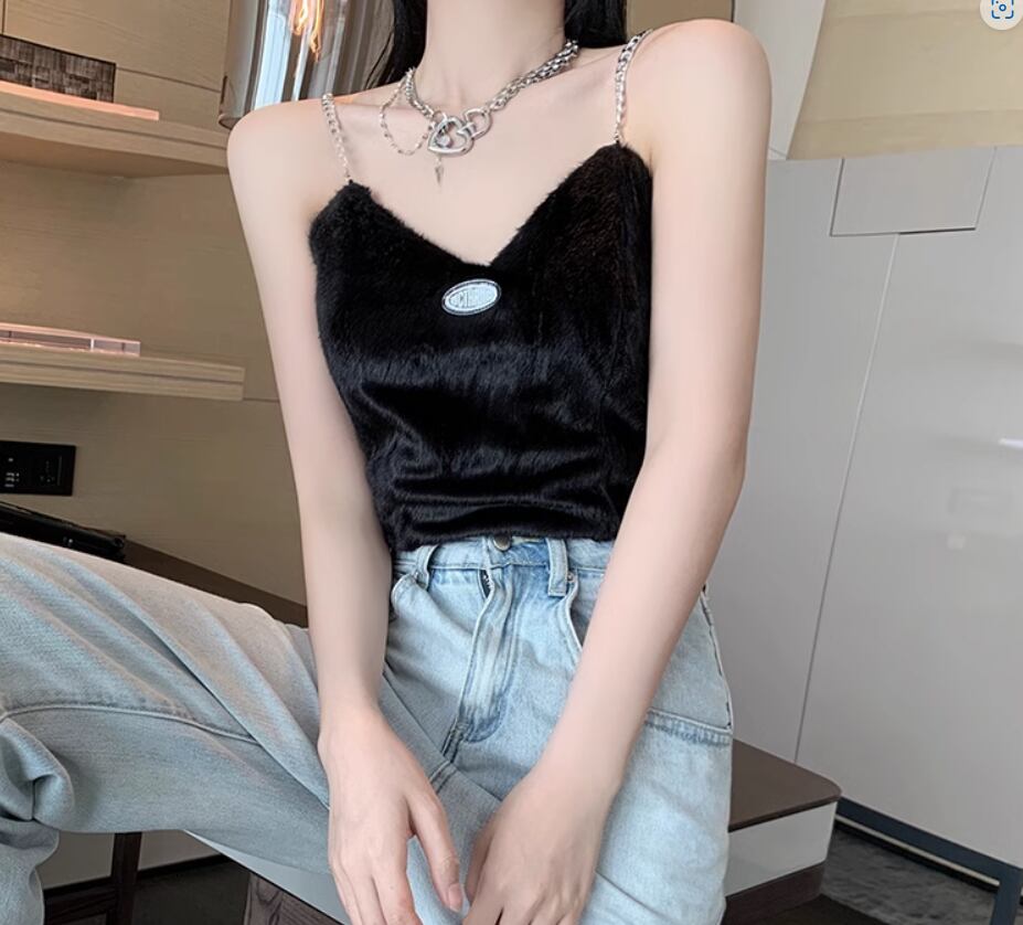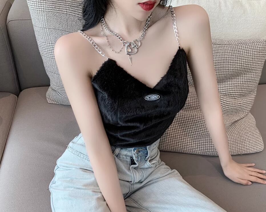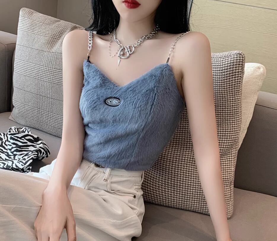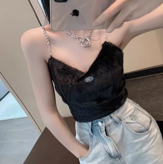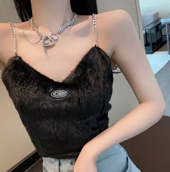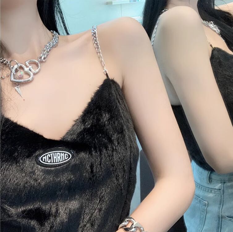 トップス チェーンストラップ キャミソール ショート丈 袖なし ノースリーブ Vネック スリム 細身 ストレート もこもこ モコモコ ふわふわ カジュアル おしゃれ お洒落 かっこいい こなれ感 個性的 存在感 無地 秋 冬 10代 20代 レディース 女性用 お出かけ 休日 イベント 着回し 普段使い 重ね着 S M L XL 黒 ブラック 青 ブルー