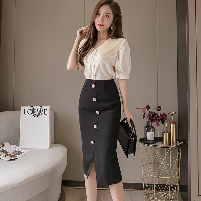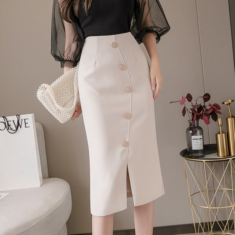 ハイウエストで美しいシルエットを演出し、膝上のスリットとデザインボタンがエレガントなポイントとなっています。