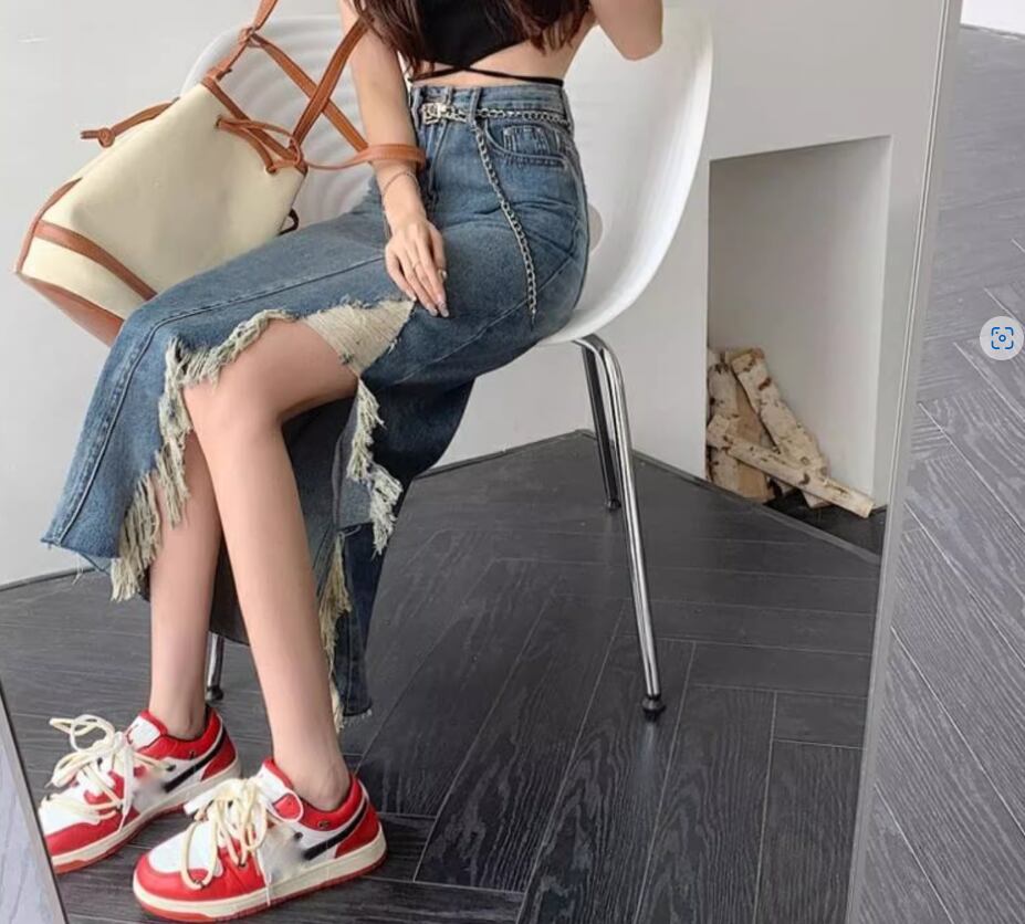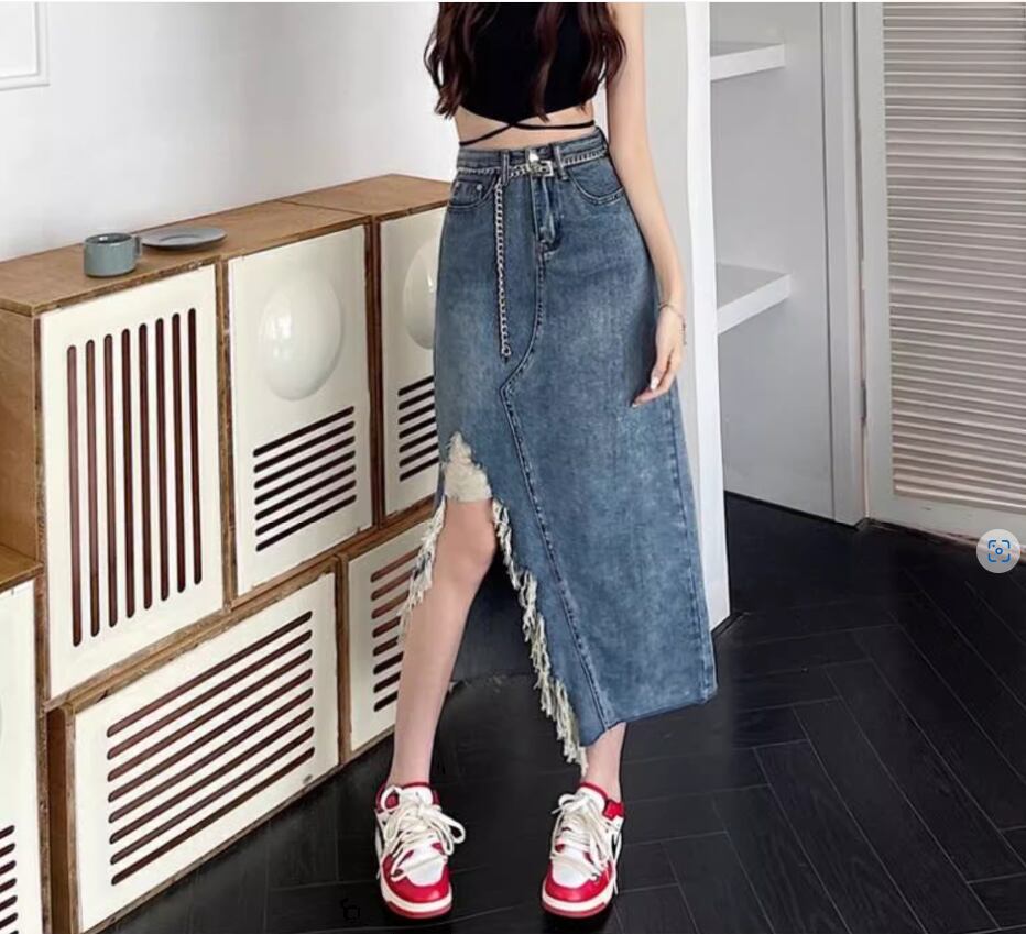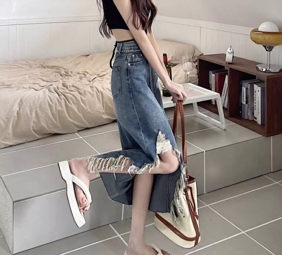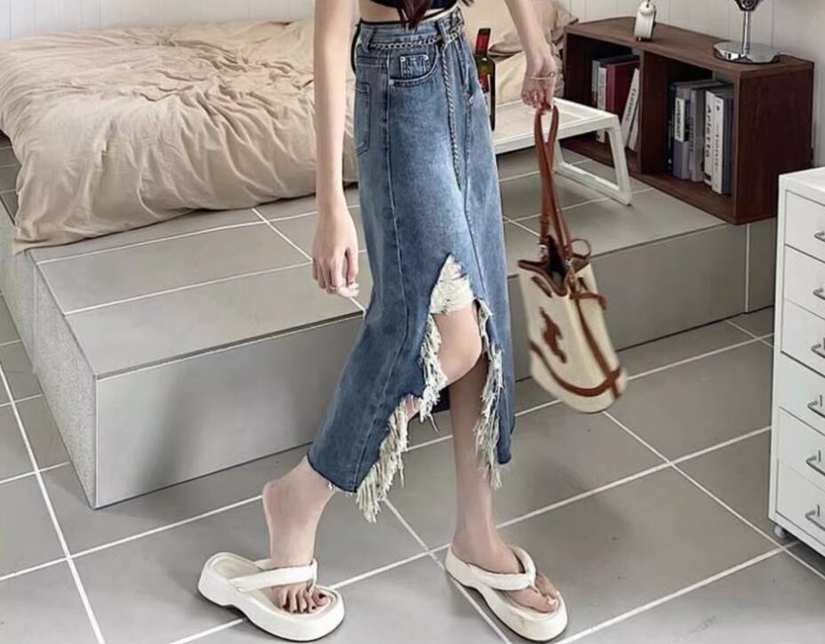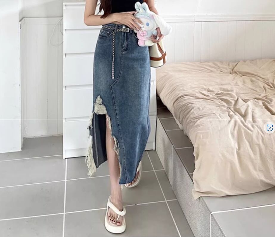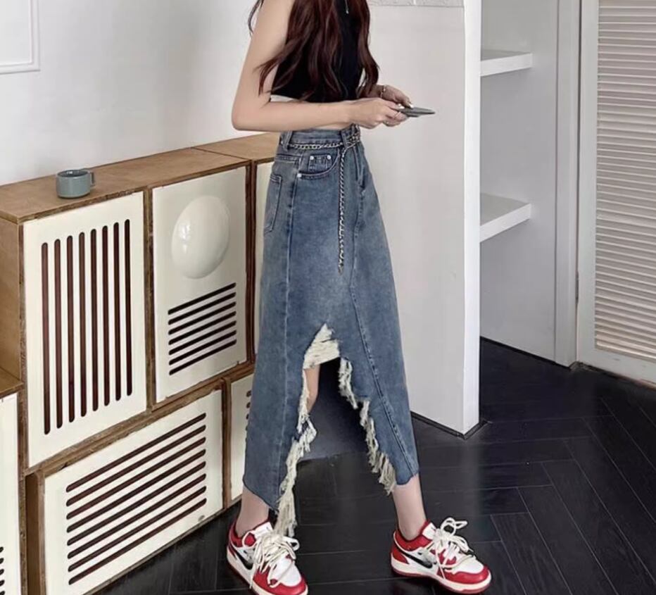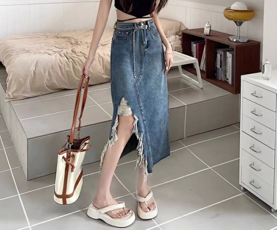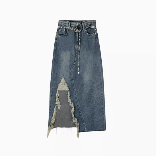 大胆なダメージ加工が目をひくチェーンベルト付きデニムスカート