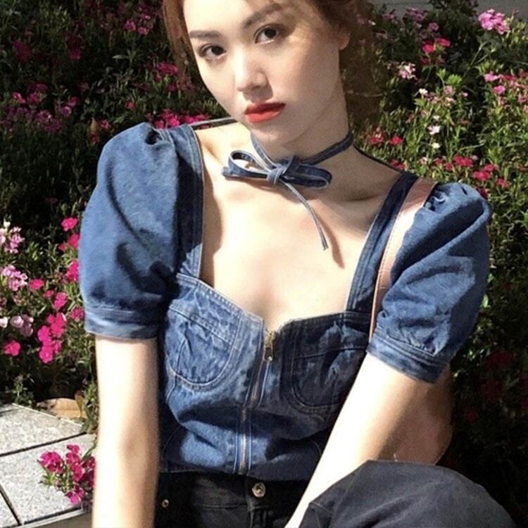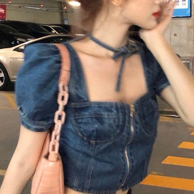 パフスリーブとスクエアネックが女性らしさを引き立てる一方、デニム素材がクールで個性的な雰囲気を演出します。