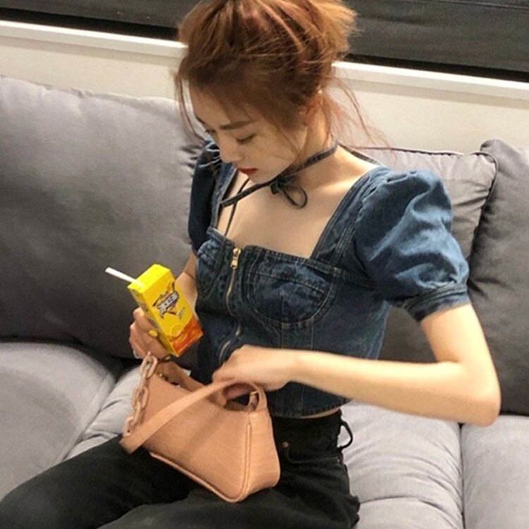 トップス シャツ デニムシャツ ショート丈 半袖 パフスリーブ スクエアネック 前開き ファスナー かわいい 大人可愛い きれいめ シンプル 上品 おしゃれ かっこいい レトロ きちんと こなれ感 個性的 主役級 存在感 抜け感 オールシーズン ナチュラル ベーシック キュート クール メンズライク 無地 レディース 女性用 ママ OL 通勤 オフィス 学生 通学 デート お出かけ お泊まり イベント 女子会 休日 カフェ ショッピング レストラン コンパ レイヤード 重ね着 普段使い 着回し S M L