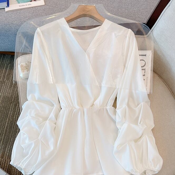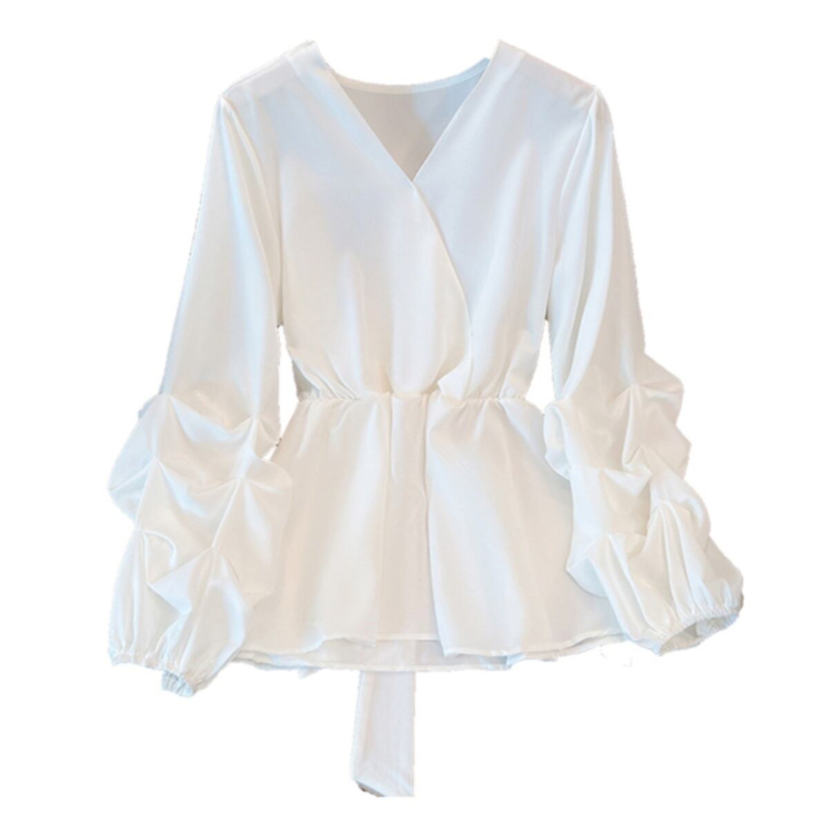 トップス ブラウス プルオーバー ミディアム丈 長袖 ボリューム袖 Vネック ウエストマーク かわいい 大人可愛い きれいめ シンプル 上品 おしゃれ かっこいい レトロ こなれ感 個性的 主役級 存在感 抜け感 オールシーズン ナチュラル ベーシック キュート メンズライク 無地 レディース 女性用 ママ OL 通勤 オフィス 学生 通学 デート お出かけ お泊まり イベント 女子会 休日 アウトドア カフェ ショッピング レストラン コンパ レイヤード 重ね着 普段使い 着回し L XL 2XL