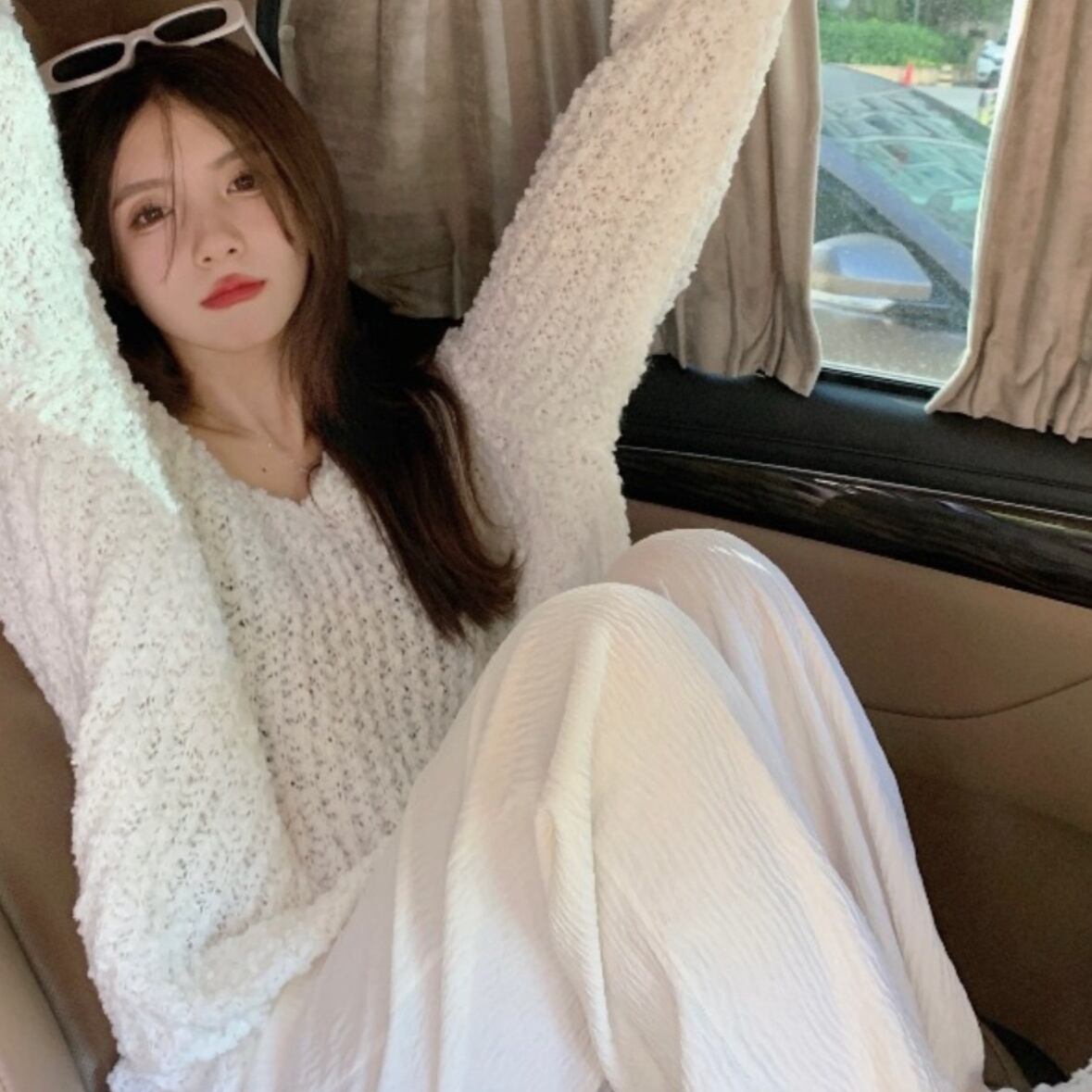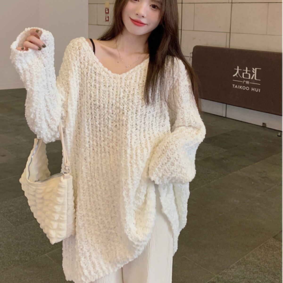 Vネックと萌袖、透かし編みのデザインが特徴で、大人可愛い雰囲気を演出してくれます。