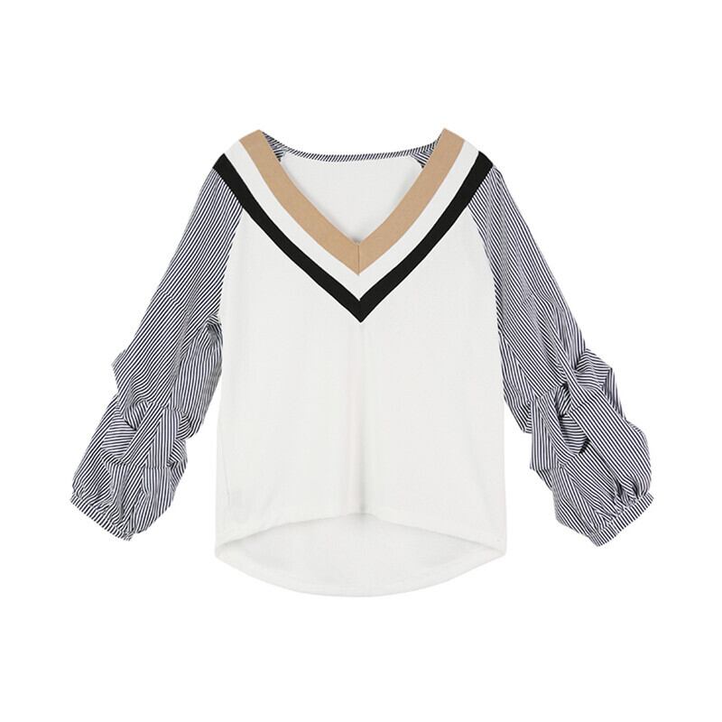 トップス シャツ ブラウス ミディアム丈 プルオーバー 長袖 ボリューム袖 Vネック 異素材ミックス かわいい 大人可愛い きれいめ シンプル 上品 おしゃれ かっこいい レトロ きちんと こなれ感 個性的 主役級 存在感 抜け感 オールシーズン ナチュラル ベーシック キュート クール メンズライク レディース 女性用 ママ OL 通勤 オフィス 学生 通学 デート お出かけ お泊まり イベント 女子会 休日 カフェ ショッピング レストラン コンパ レイヤード 重ね着 普段使い 着回し M L