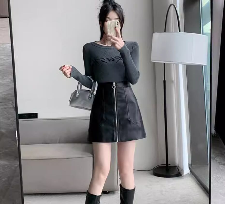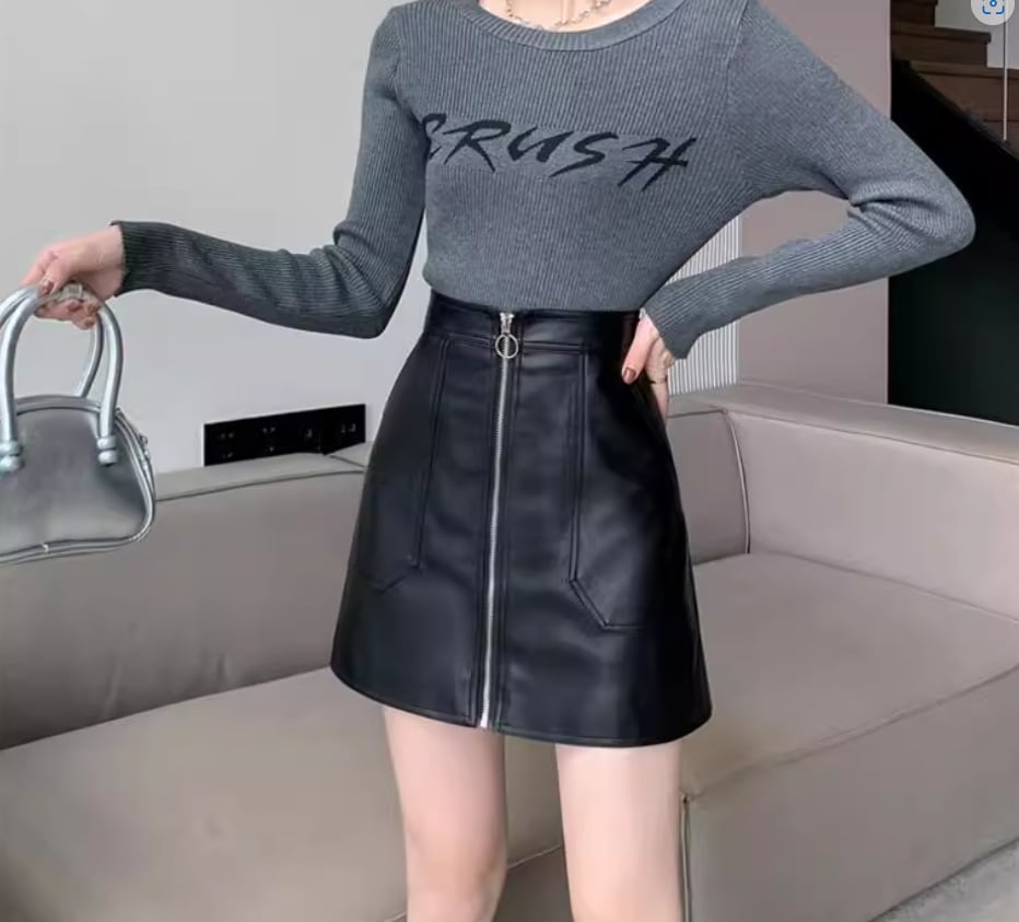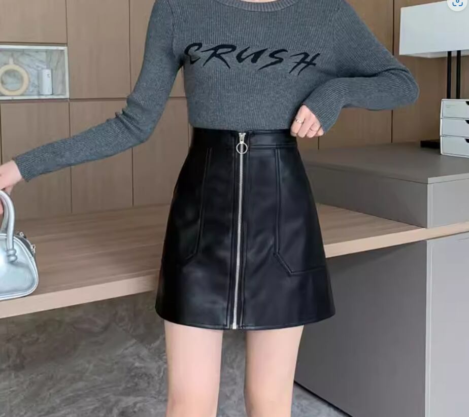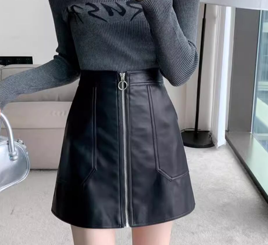 綺麗な台形シルエットとファスナーがアクセントのフェイクレザースカート