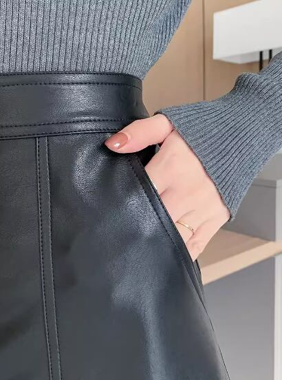 フェイクレザーミニスカート Aライン ポケット ハイウエスト ポリエステル シンプル おしゃれ お洒落 かっこいい 大人女子 こなれ感 クール モード系 存在感 無地 秋 冬 10代 20代 30代 レディース 女性用 お出かけ 休日 着回し 普段使い M L XL 2XL 黒 ブラック