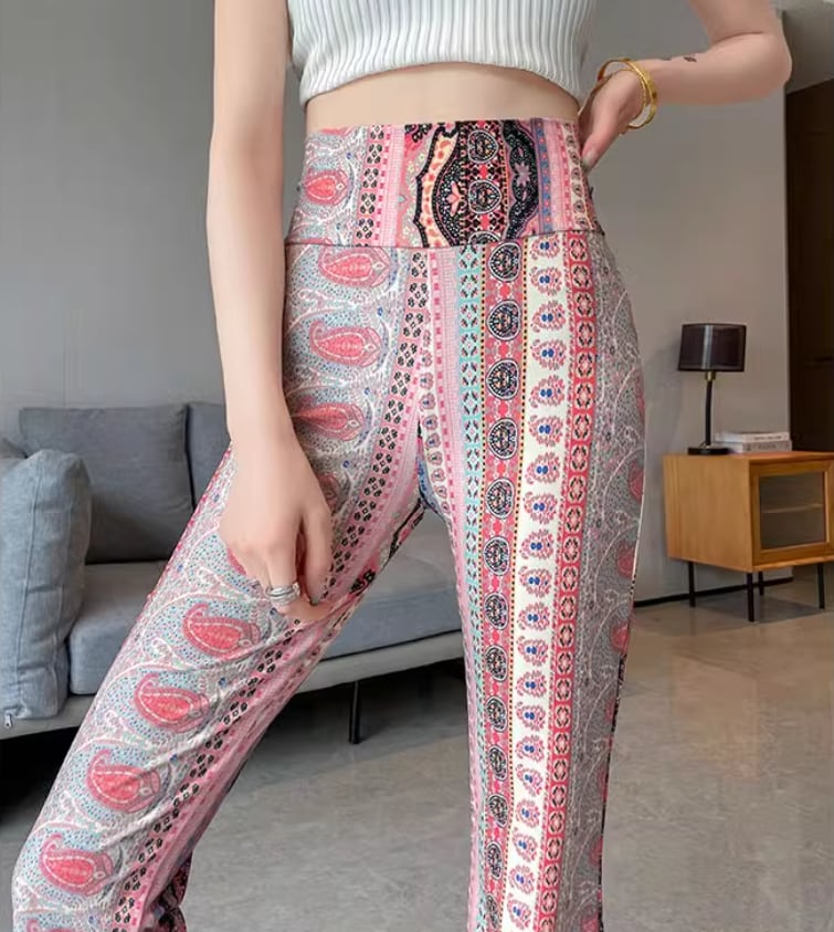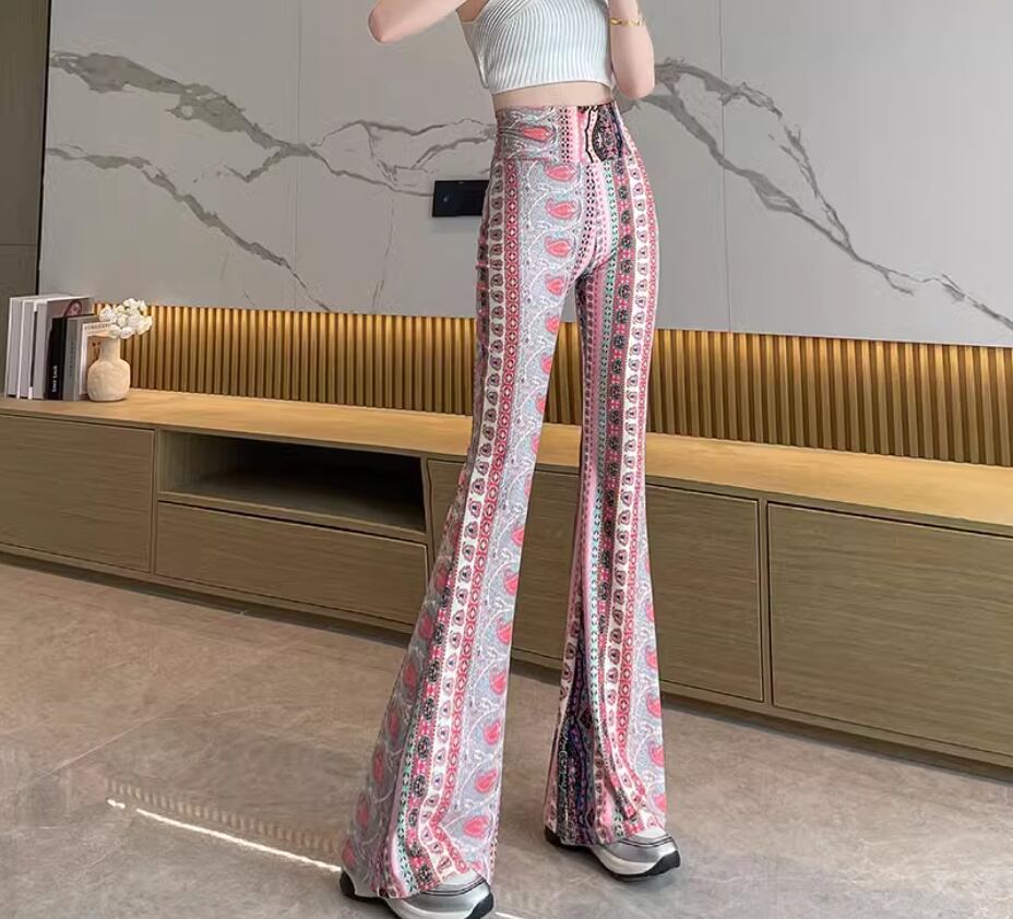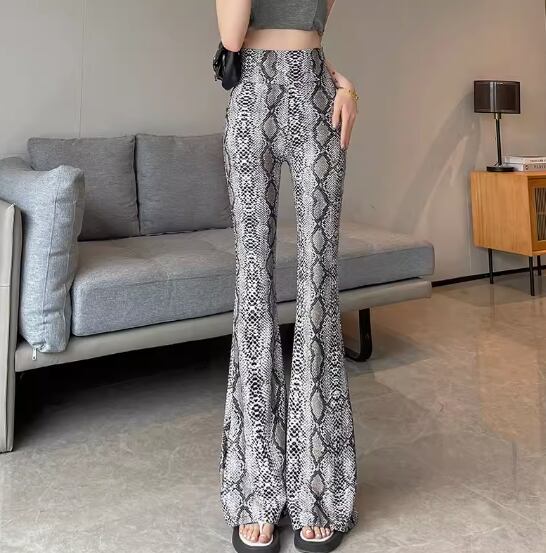 フレアパンツ ヨガパンツ パンツ ロング丈 フレア ハイウエスト ウエストゴム 伸縮性 かっこいい 個性的 存在感 フラワー パイソン柄 春 夏 10代 20代 30代 40代 レディース 女性用 ヨガ 着回し 美脚 脚長 S M L XL 2XL