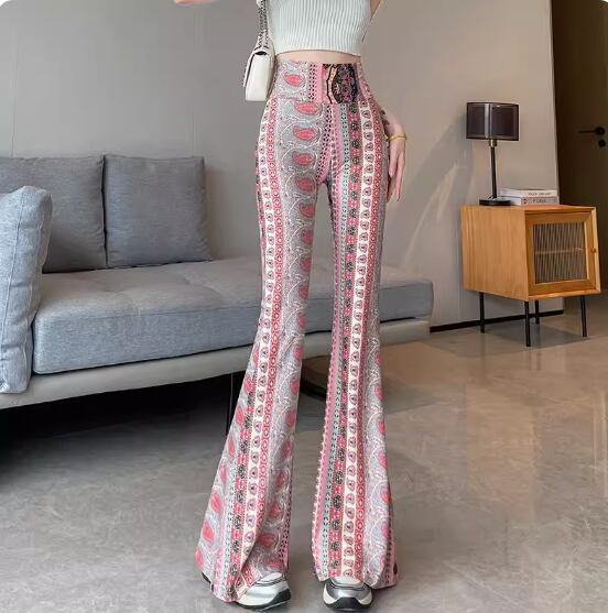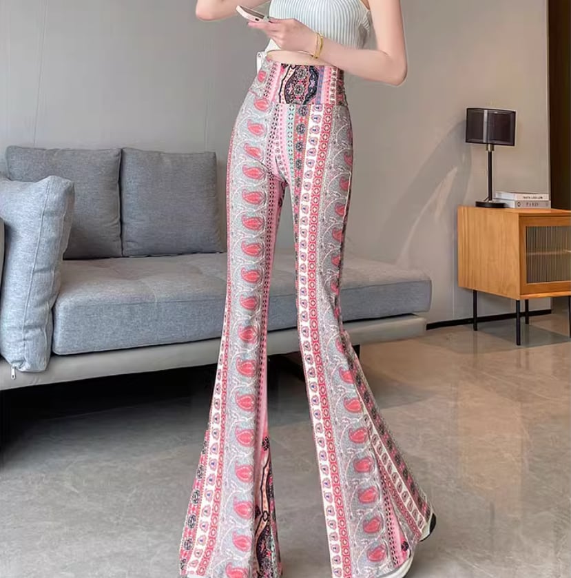 パイソン柄とフラワー柄の総柄が目をひくフレアパンツ