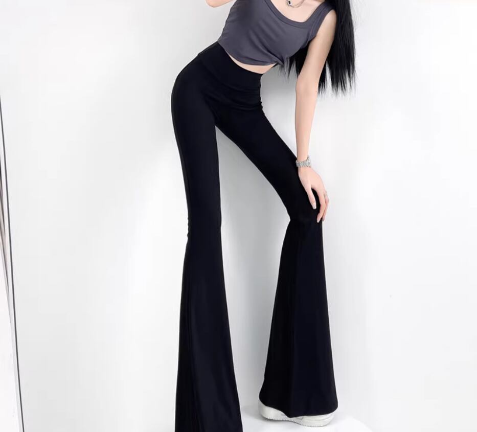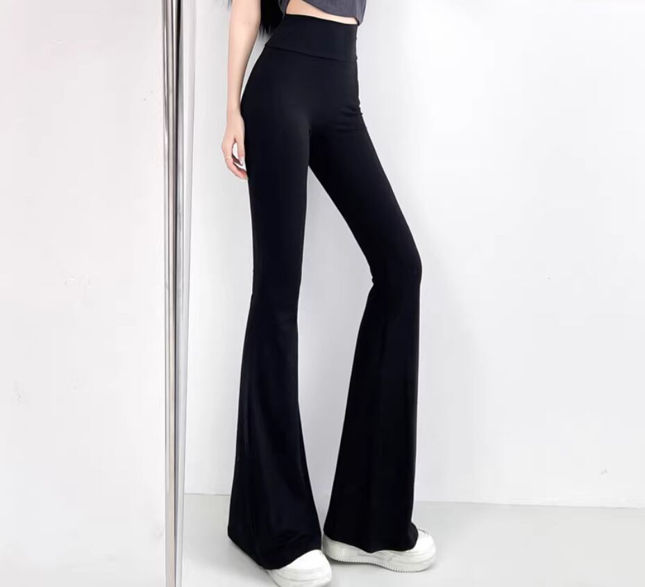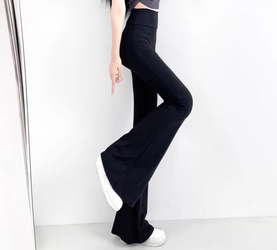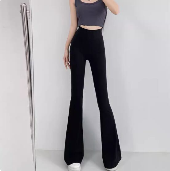 ウエストゴムフレアパンツ ヨガパンツ ロング丈 フレア スリム 細身 ハイウエスト 伸縮性 綿 シンプル スポーティー 無地 春 夏 秋 冬 オールシーズン 10代 20代 30代 40代 レディース 女性用 ジム ヨガ イベント 着回し 普段使い 美脚 脚長 黒 ブラック