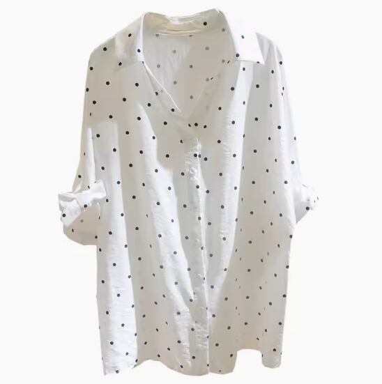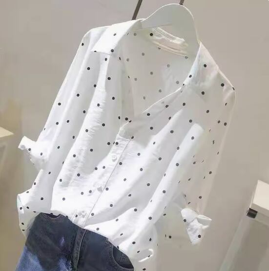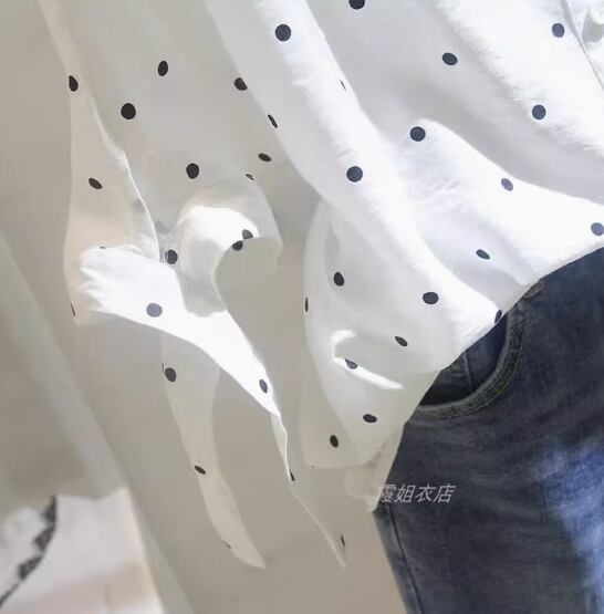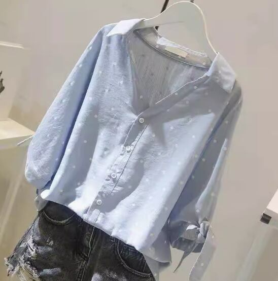 ドット柄半袖シャツ 白トップス 袖あり 半袖 5分袖 五分袖 襟付き ストレート リボン 透け感 綿 かわいい 大人可愛い シンプル カジュアル おしゃれ お洒落 ドット柄 水玉 春 夏 10代 20代 30代 40代 レディース 女性用 お出かけ 休日 着回し 普段使い S L XL 2XL 白 ホワイト ブルー