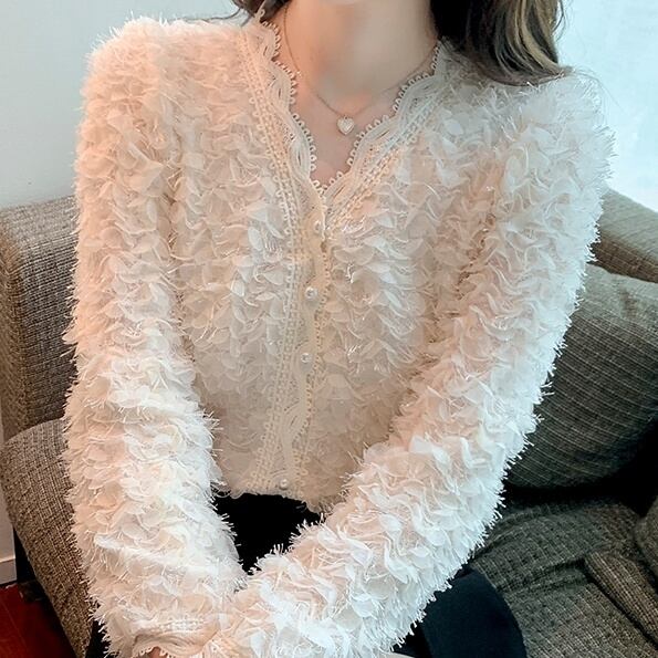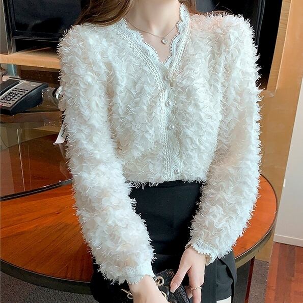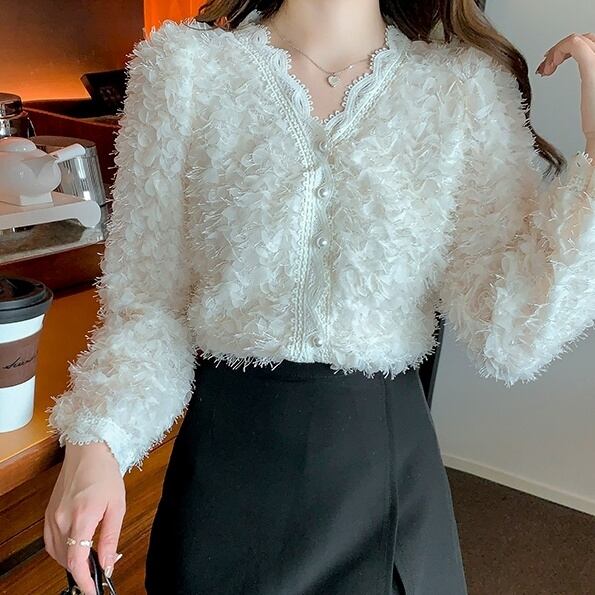 Vネックと前開きのスタイルは、女性らしさを引き立てながら、さりげないセクシーさも演出します。