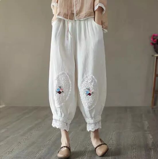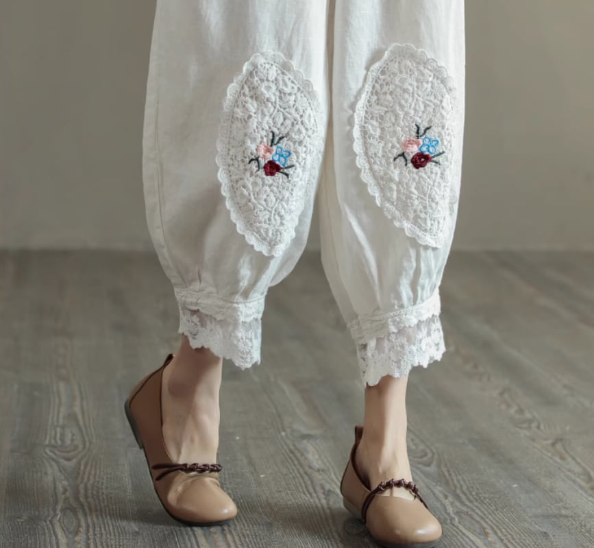 裾のレースと刺繍が個性的なカジュアルパンツ
