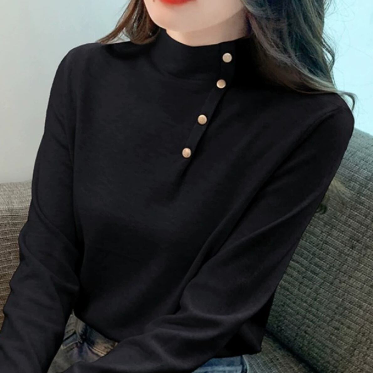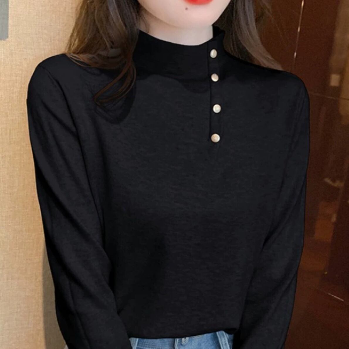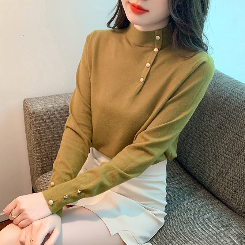 トップス カットソー ミディアム丈 プルオーバー 長袖 ボトルネック デザインボタン 袖ボタン ハーフボタン かわいい 大人可愛い きれいめ シンプル 上品 おしゃれ かっこいい レトロ きちんと こなれ感 個性的 主役級 存在感 抜け感 秋 冬 ナチュラル ベーシック キュート クール エレガント フォーマル 無地 レディース 女性用 ママ OL 通勤 オフィス 学生 通学 デート お出かけ お泊まり イベント 女子会 休日 カフェ ショッピング レストラン コンパ レイヤード 重ね着 普段使い 着回し