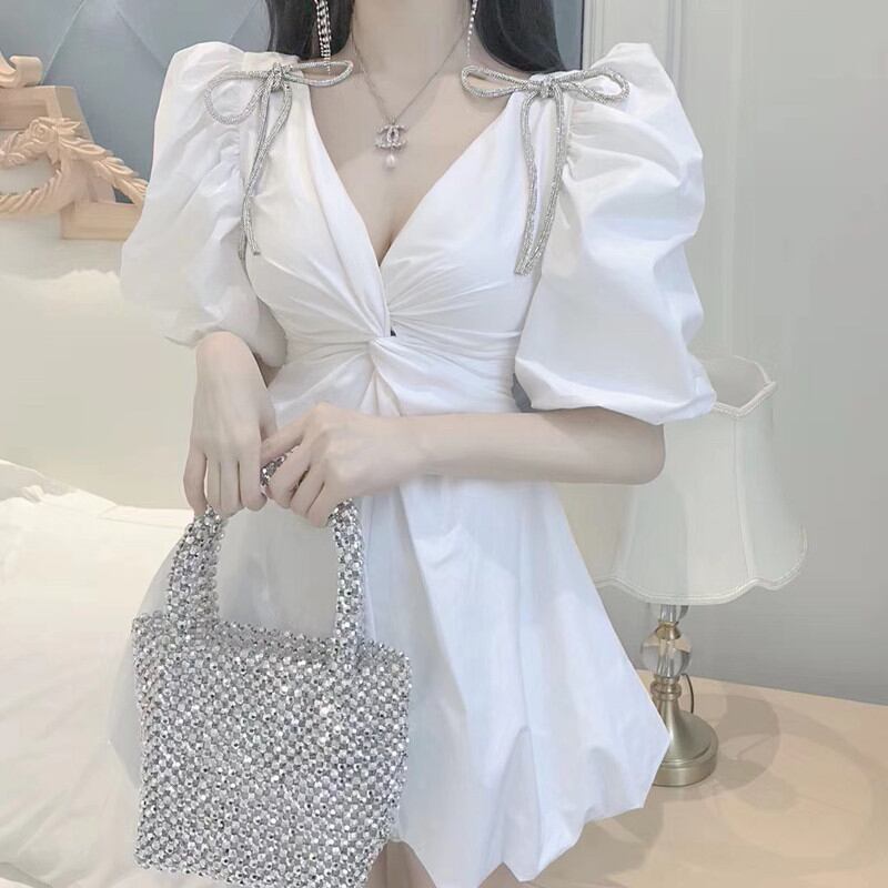 ワンピース ミニワンピース ワンピースドレス 半袖 パフスリーブ ボリューム袖 ウエストマーク 胸元 谷間 ミニ丈 かわいい 大人可愛い きれいめ シンプル 上品 おしゃれ かっこいい レトロ こなれ感 個性的 主役級 存在感 抜け感 オールシーズン キュート ナチュラル ベーシック セクシー クール ガーリー 無地 レディース 女性用 OL 通勤 学生 通学 デート お出かけ お泊まり イベント 女子会 休日 カフェ ショッピング レストラン コンパ レイヤード 重ね着 普段使い 着回し 脚長 美脚