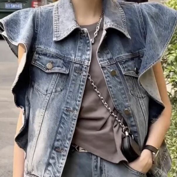 レディース トップス ベスト アウター デート Gジャン 上着 袖なし ノースリーブ 襟付き 切り替えデザイン フリル 前開き デニム ブルーデニム かわいい 大人可愛い きれいめ シンプル カジュアル 上品 おしゃれ お洒落 レトロ 大人女子 こなれ感 ラフ ラブリー キュート ガーリー 個性的 クール モード系 エレガント モダン 主役級 存在感 抜け感 レディース デート お出かけ 女子会 休日 着回し 普段使い ファッション コーデ スタイル モテ プレゼント 定番 トレンド インスタ映え
