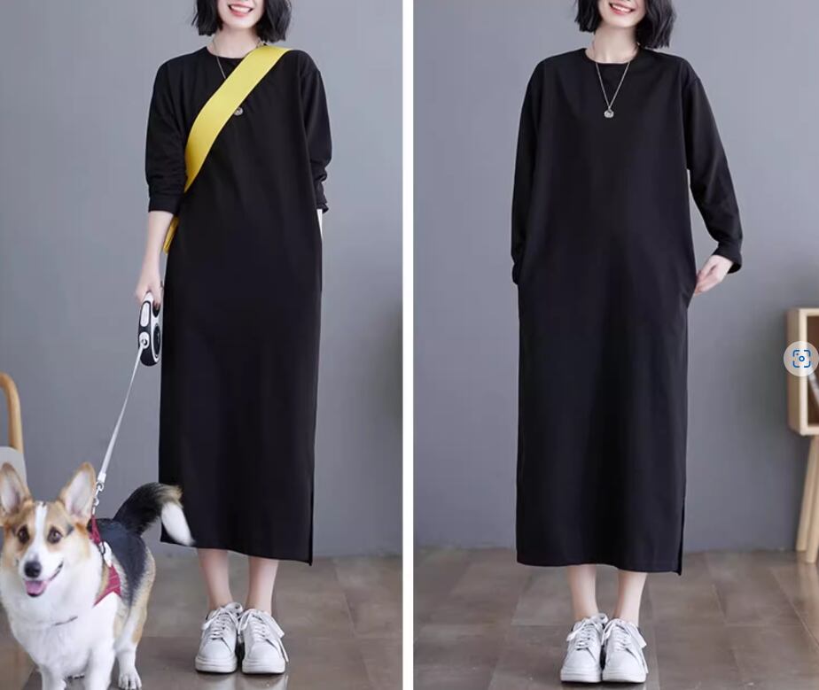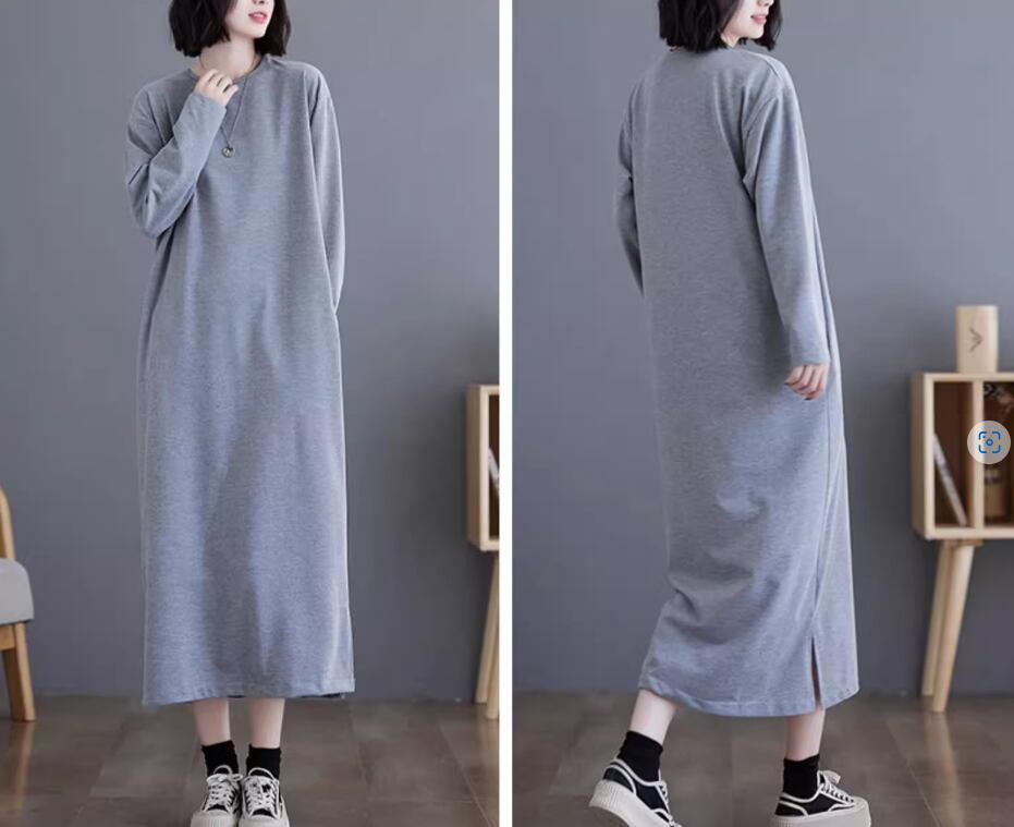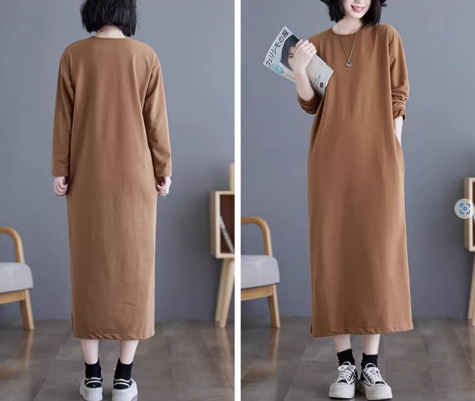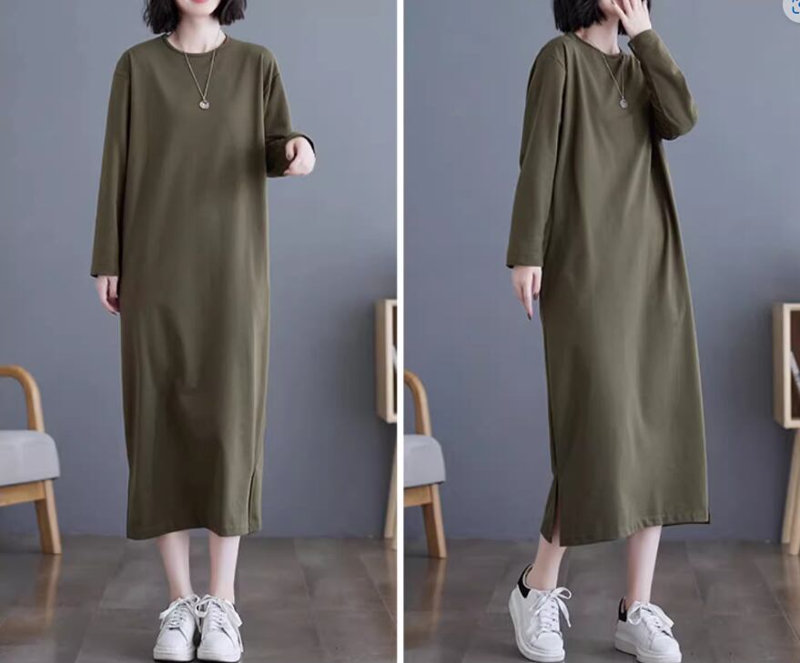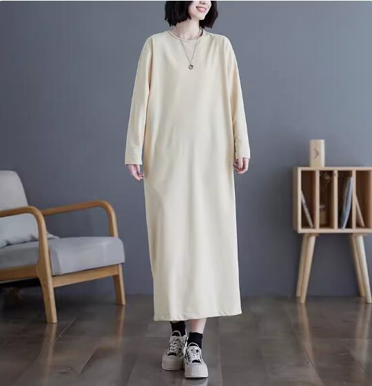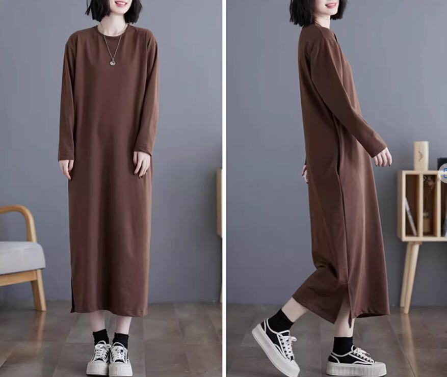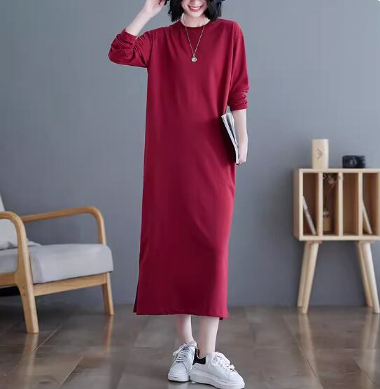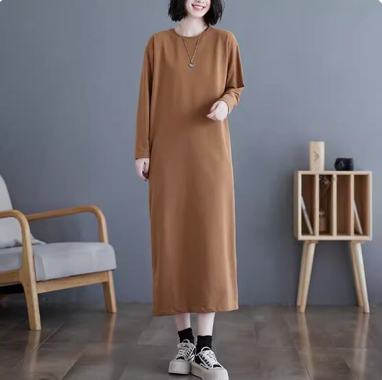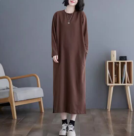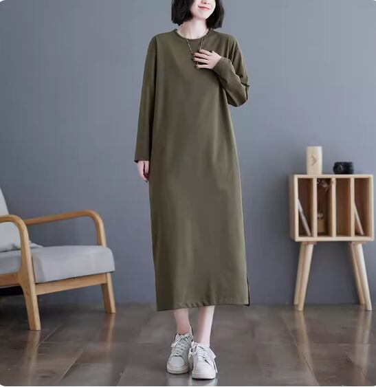 ロング丈カットワンピース 長袖 ラウンドネック ストレート サイドスリット ポケット 伸縮性 シンプル カジュアル 無地 春 夏 秋 冬 オールシーズン 10代 20代 30代 40代 レディース 女性用 ママ お出かけ 休日 着回し 普段使い 重ね着 楽ちん 体型カバー M L XL 2XL 黒 ブラック カーキ アプリコット ブルゴーニュ アーミーグリーン ライトグレー コーヒー