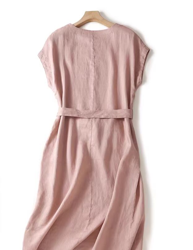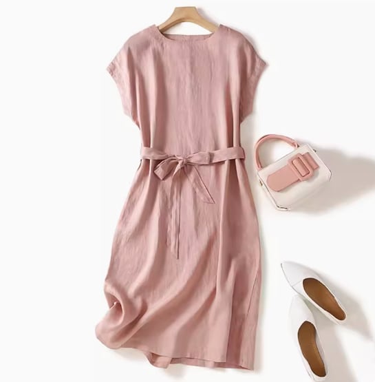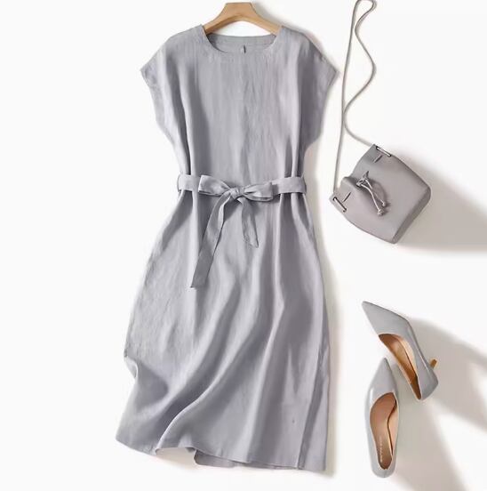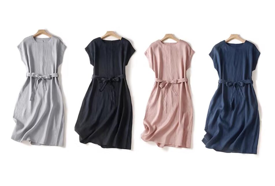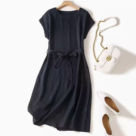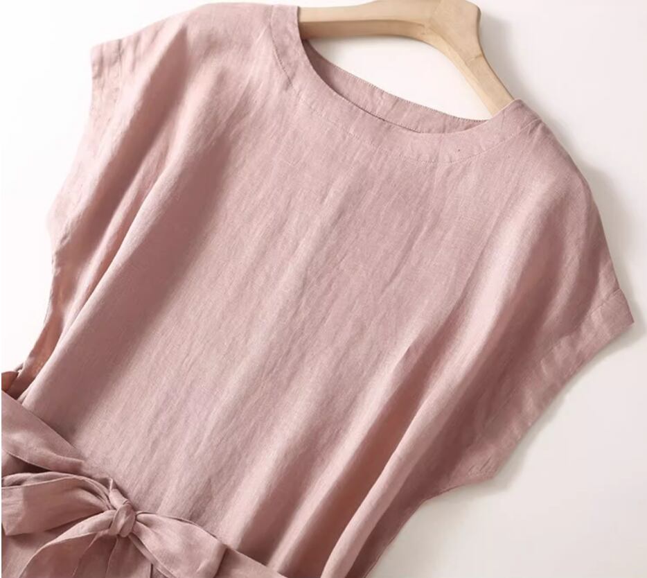 綿麻ワンピース ひざ丈 フレンチスリーブ ラウンドネック Aライン ウエストリボン ハイウエスト 大人可愛い きれいめ シンプル 大人 上品 おしゃれ お洒落 大人女子 こなれ感 とろみ感 無地 春 夏 20代 30代 40代 レディース 女性用 通勤 お出かけ 休日 着回し 普段使い 重ね着 M L XL 2XL 黒 ブラック ピンク ネイビー ライトグレー