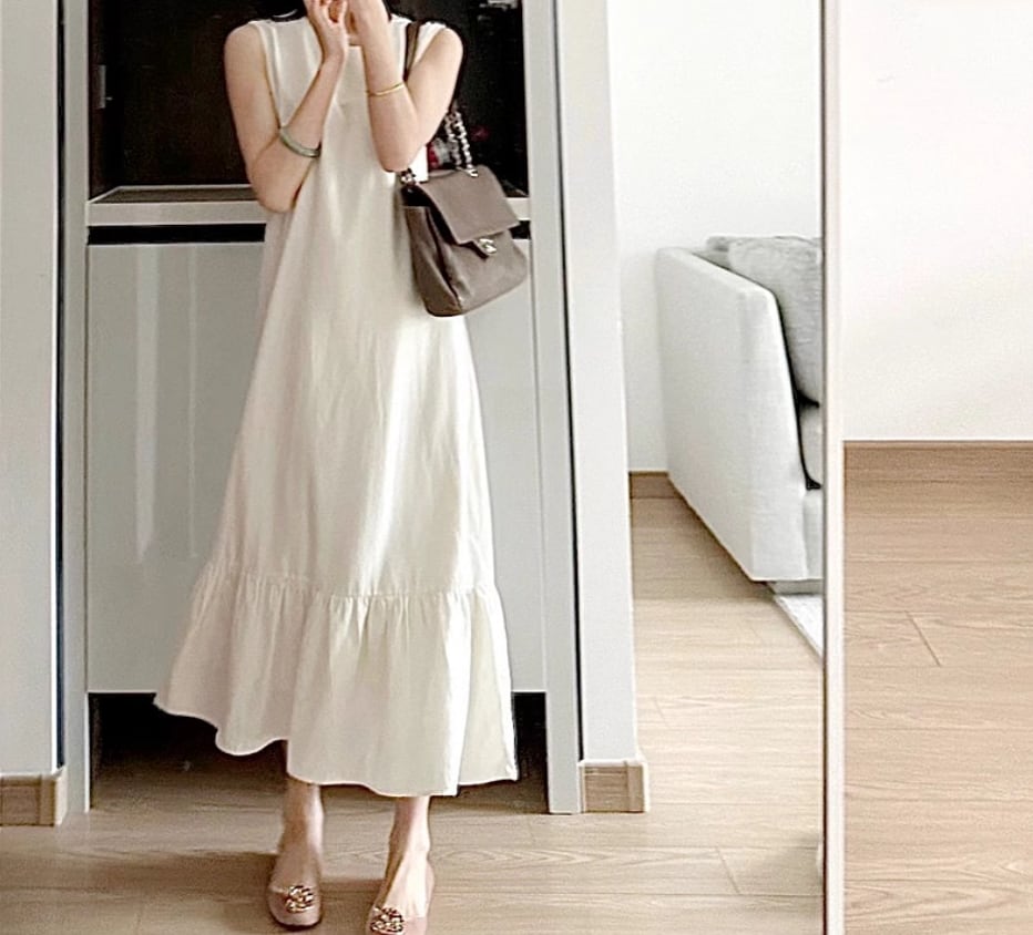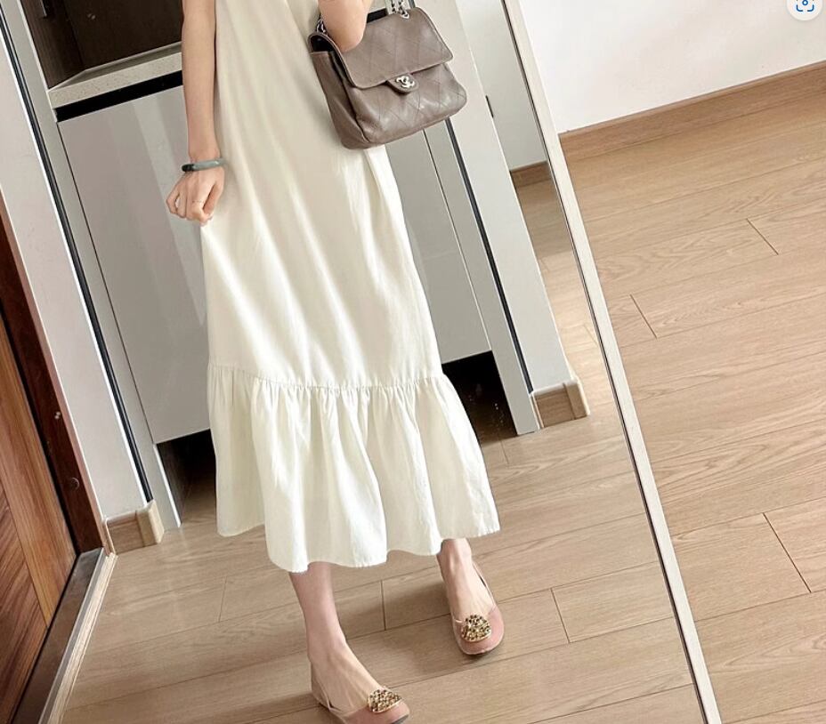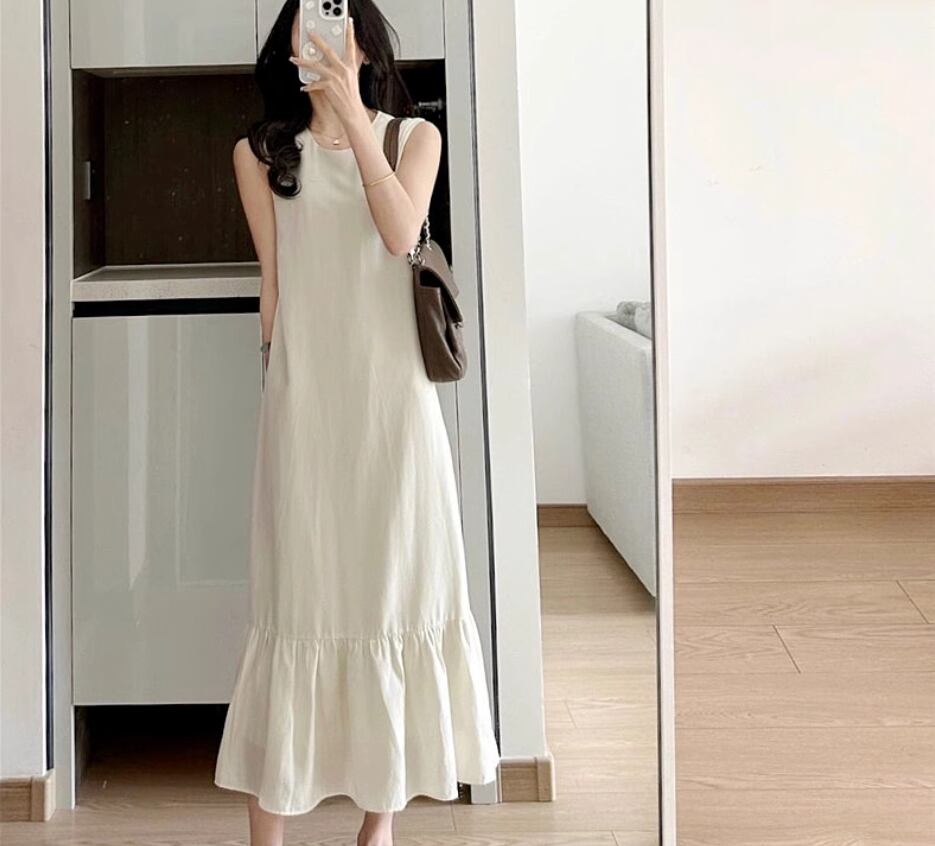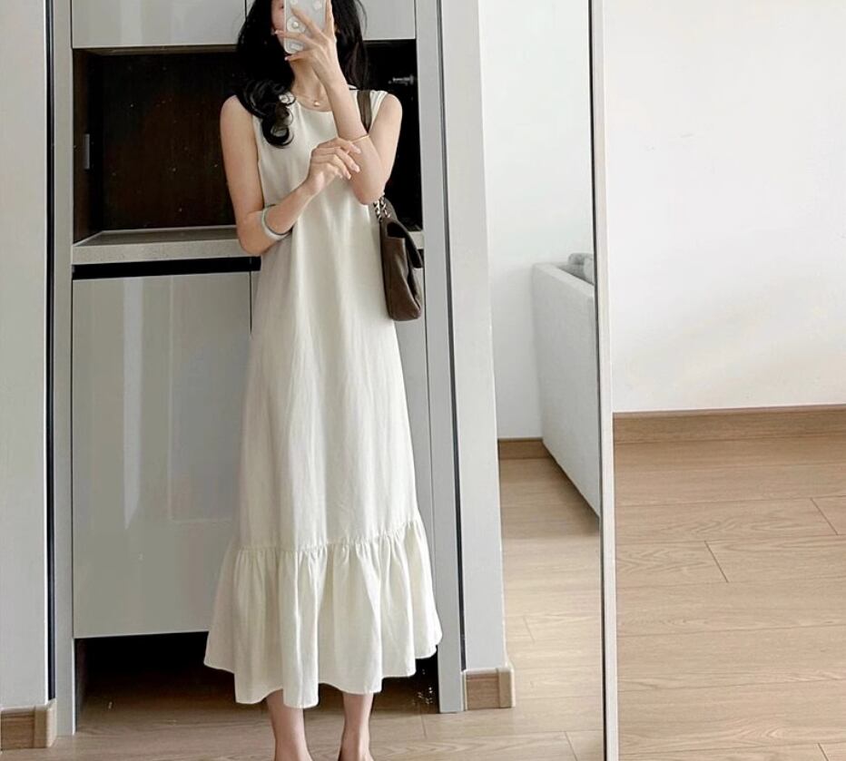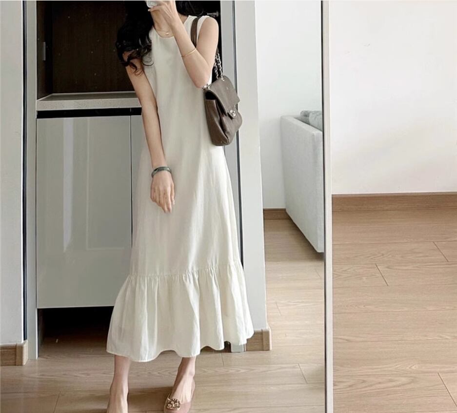 ノースリーブワンピース 袖なし ノースリーブ ラウンドネック Aライン 切り替えデザイン フリル 伸縮性 綿 かわいい 大人可愛い きれいめ シンプル カジュアル おしゃれ お洒落 大人女子 無地 春 夏 秋 10代 20代 30代 40代 レディース 女性用 デート お出かけ 休日 リゾート 旅行 海 着回し 普段使い 重ね着 S M L XL 2XL ベージュ