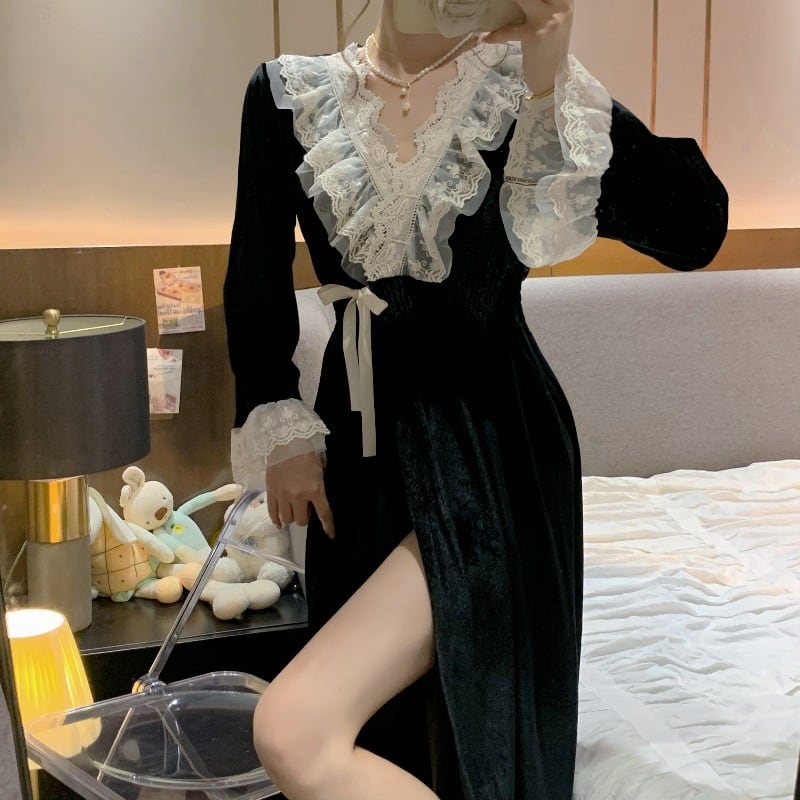 ナイトウエア ナイトガウン ガウン 長袖 Vネック フリル ウエストリボン ベルベット ルームウエア 部屋着 かわいい 大人可愛い きれいめ シンプル 上品 おしゃれ かっこいい レトロ きちんと こなれ感 個性的 主役級 存在感 抜け感 秋 冬 ナチュラル ベーシック キュート クール セクシー ガーリー 無地 レディース 女性用 ママ マタニティ デート お出かけ お泊まり イベント 女子会 休日 ホテル アウトドア レイヤード 重ね着 普段使い 着回し ワンサイズ トレンド 楽ちん ゆったり