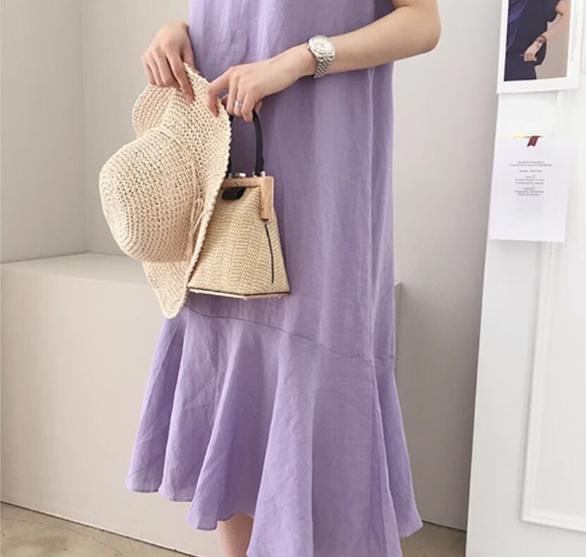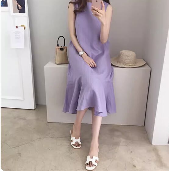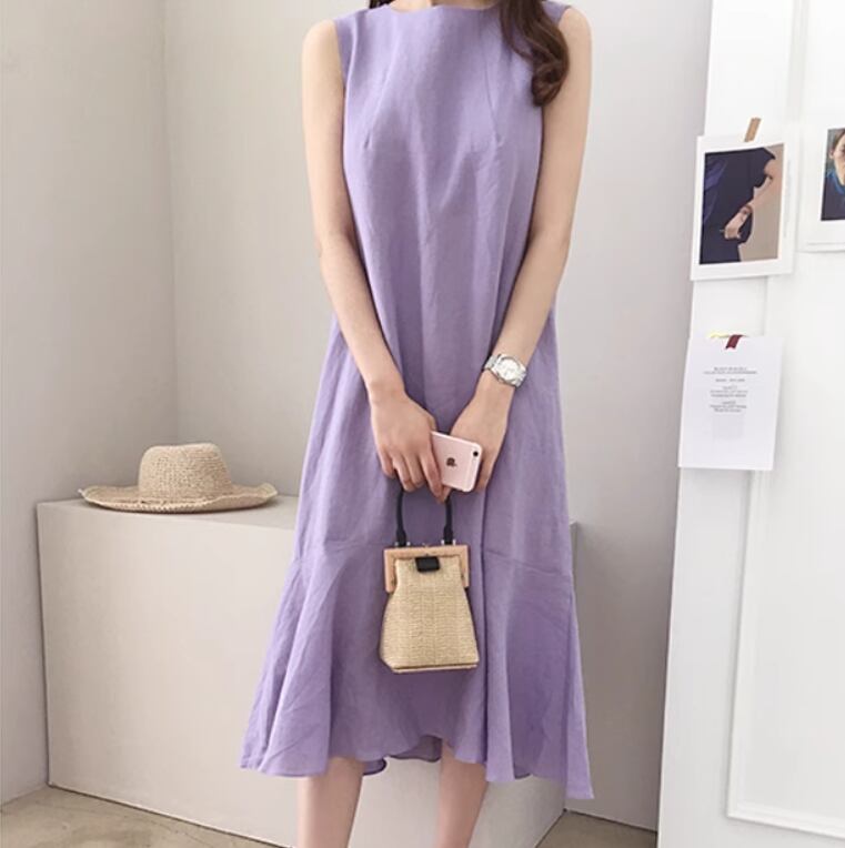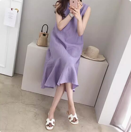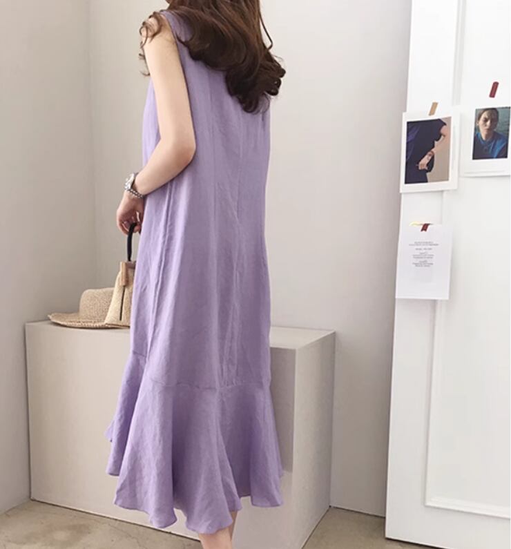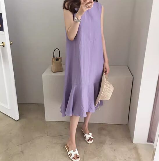 フィッシュテールワンピース 袖なし ノースリーブ ラウンドネック Aライン アシンメトリー 切り替えデザイン フリル 綿 麻 リネン 大人可愛い きれいめ シンプル カジュアル 大人 上品 おしゃれ お洒落 大人女子 エレガント とろみ感 無地 春 夏 20代 30代 40代 レディース 女性用 デート お出かけ 休日 リゾート 旅行 着回し 普段使い 重ね着 楽ちん S M L XL 紫 パープル