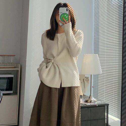 今人気急上昇中のニットカーディガン。Uネックで女性らしいデザイン、前開きのボタンで着脱もラクラク。何にでも合わせやすいシンプルなデザインながらも、大人可愛い雰囲気たっぷり。さらに、ゆるっとしたサイズ感で体型カバーも叶います。オフィスやデート、お出かけやイベントまで、幅広いシーンで活躍してくれる一枚です。