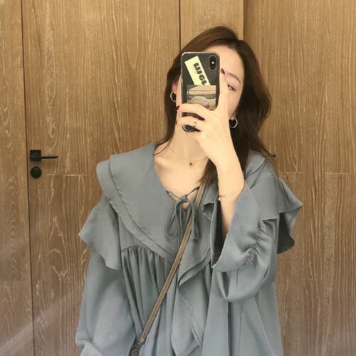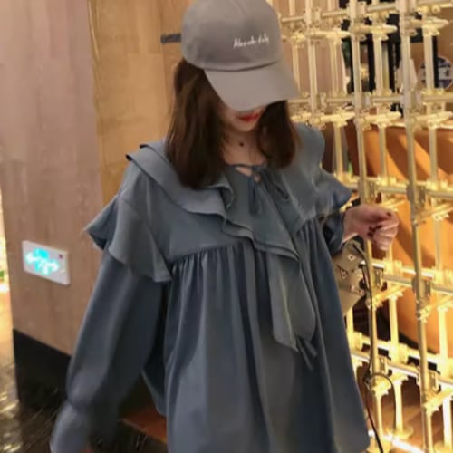 シャツ ブラウス トップス レディース フリル襟 ビッグカラー 長袖 襟付き シャツブラウス ボリューム袖 バルーン袖 韓国 ファッション フリルブラウス ガーデン ショッピング ヘイズブルー S