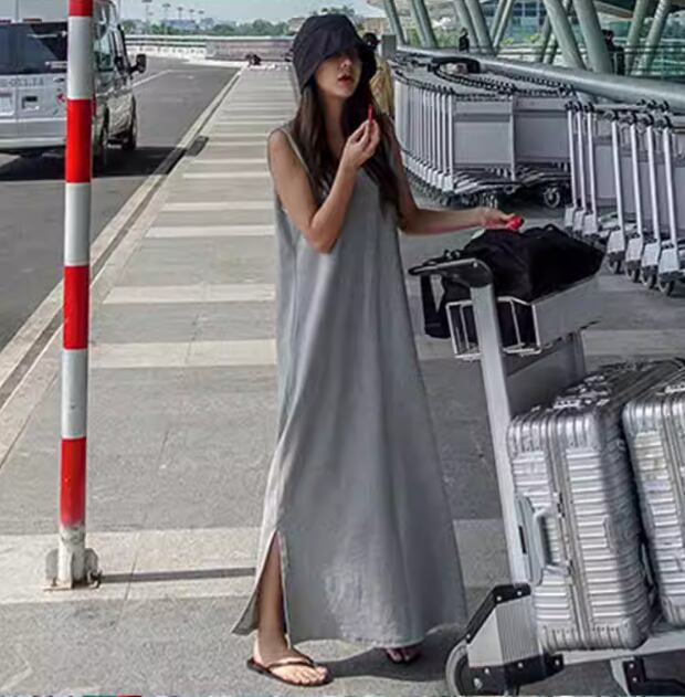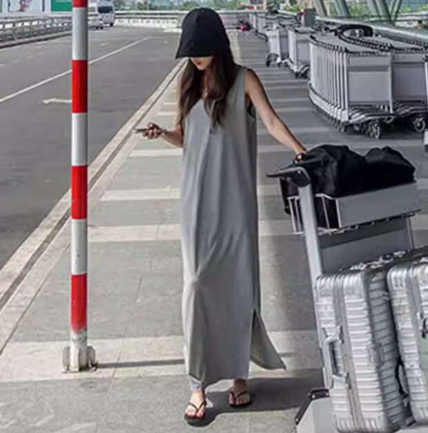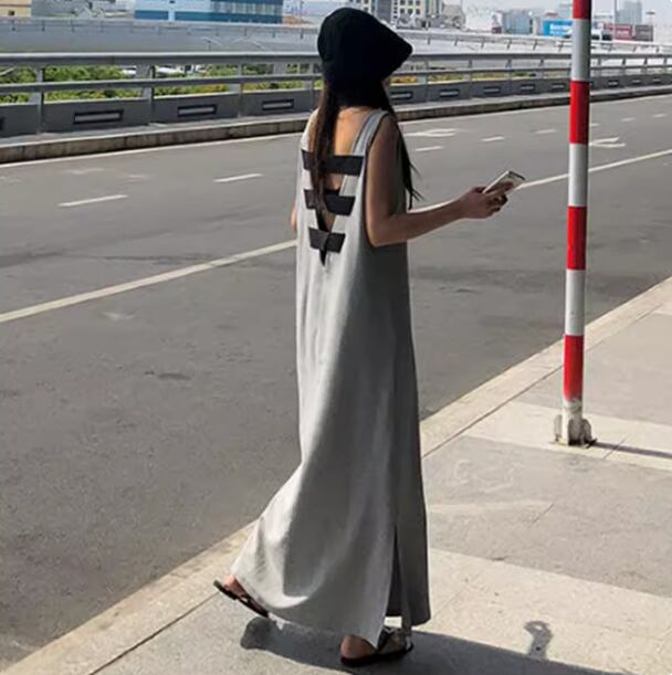 ワンピース ロング丈 袖なし ノースリーブ ラウンドネック 襟なし セミフレア Aライン 背中魅せ 背中紐 ハイウエスト 薄手 かわいい 大人可愛い シンプル カジュアル おしゃれ アジアン エスニック ラフ キュート ナチュラル 無地 夏 秋 レディース 10代 20代 30代 デート お出かけ リゾート 旅行 海 ビーチ 公園 女子会 休日 バカンス ショッピング カフェ 楽ちん 脚長 普段使いS M L L ゆったり グレー