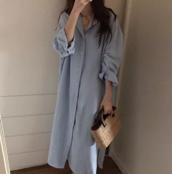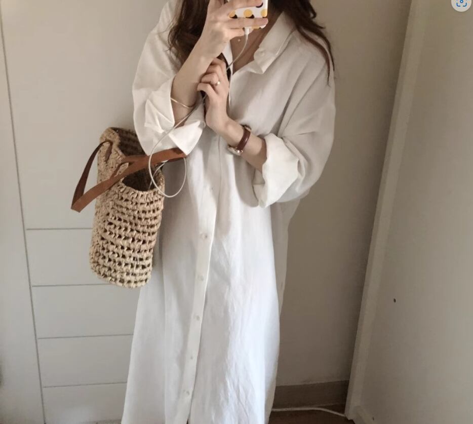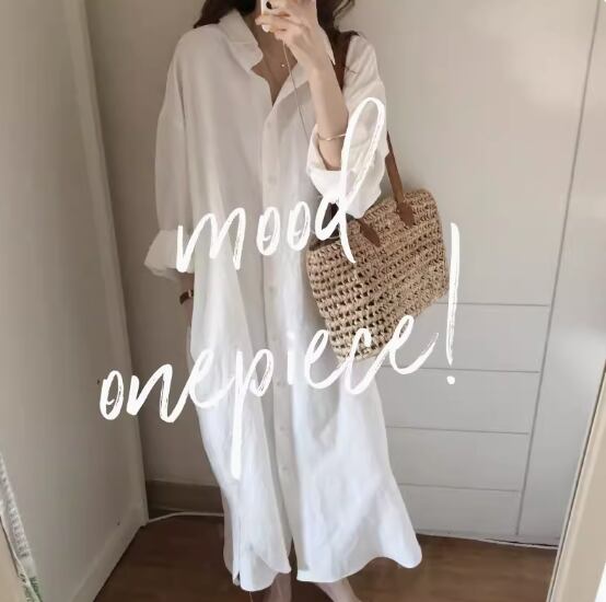 ロング丈シャツ 白トップス ロング丈 袖あり 長袖 ドロップショルダー 襟付き ワイド 綿 シンプル カジュアル 大人 上品 おしゃれ お洒落 大人女子 こなれ感 無地 春 夏 秋 冬 オールシーズン 20代 30代 40代 レディース 女性用 ママ マタニティ お出かけ 休日 着回し 普段使い 重ね着 S M L XL 白 ホワイト 青 ブルー
