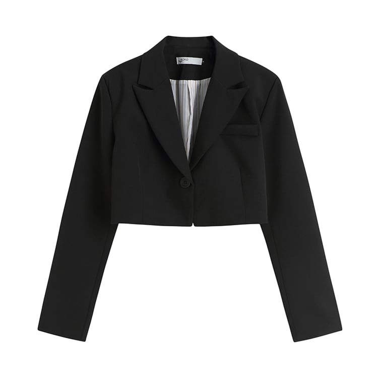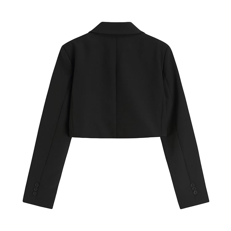ショート丈のジャケットには、胸ポケットや前開きボタンがアクセントとなり、おしゃれ度がぐんとアップ。