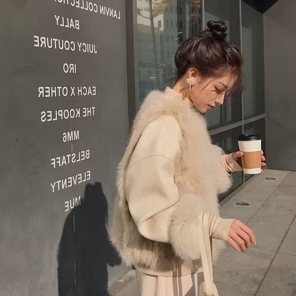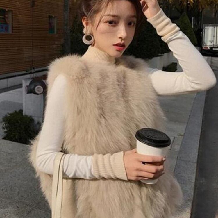 華やかなファーで彩られた、ショート丈の袖なしベストコート。