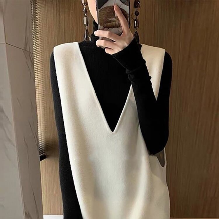 袖なしのVネックデザインが女性らしさを引き立て、サイドスリットが程よい抜け感を演出します。