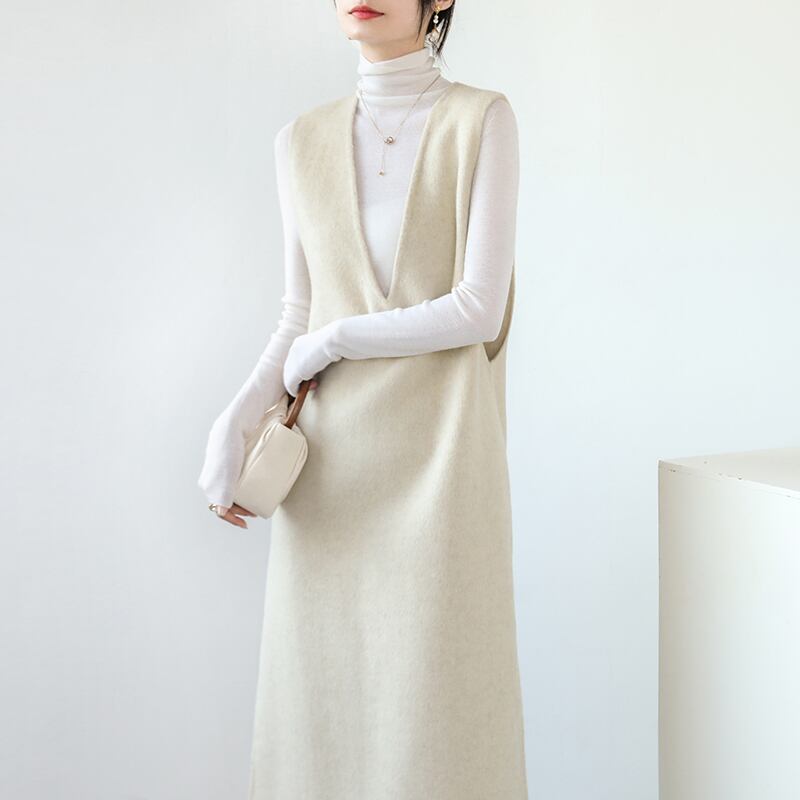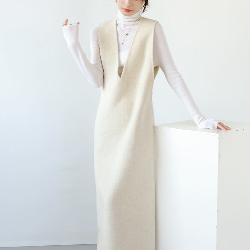 袖なしのVネックやサイドスリットが女性らしさを引き立て、どんなシーンにもマッチします。