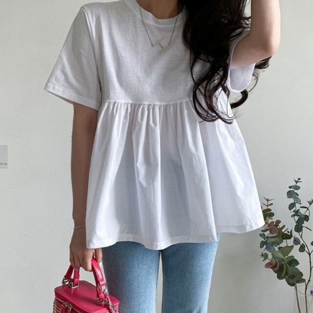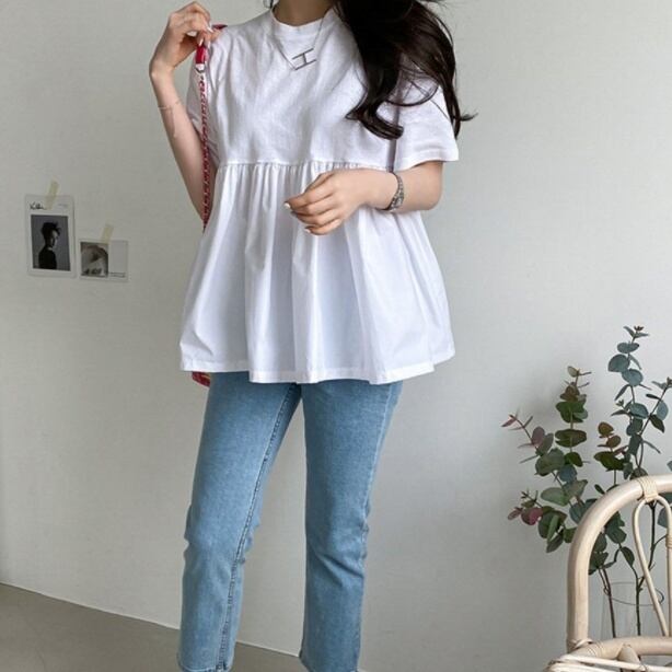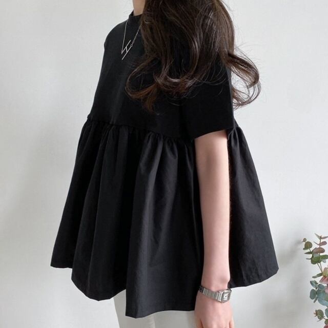 トップス シャツ ブラウス プルオーバー ミディアム丈 半袖 ラウンドネック ペプラム ウエストマーク かわいい 大人可愛い きれいめ シンプル 上品 おしゃれ かっこいい レトロ きちんと こなれ感 個性的 主役級 存在感 抜け感 春 夏 ナチュラル ベーシック キュート クール メンズライク 無地 レディース 女性用 ママ OL 通勤 オフィス 学生 通学 デート お出かけ お泊まり イベント 女子会 休日 アウトドア カフェ ショッピング レストラン コンパ レイヤード 重ね着 普段使い 着回し