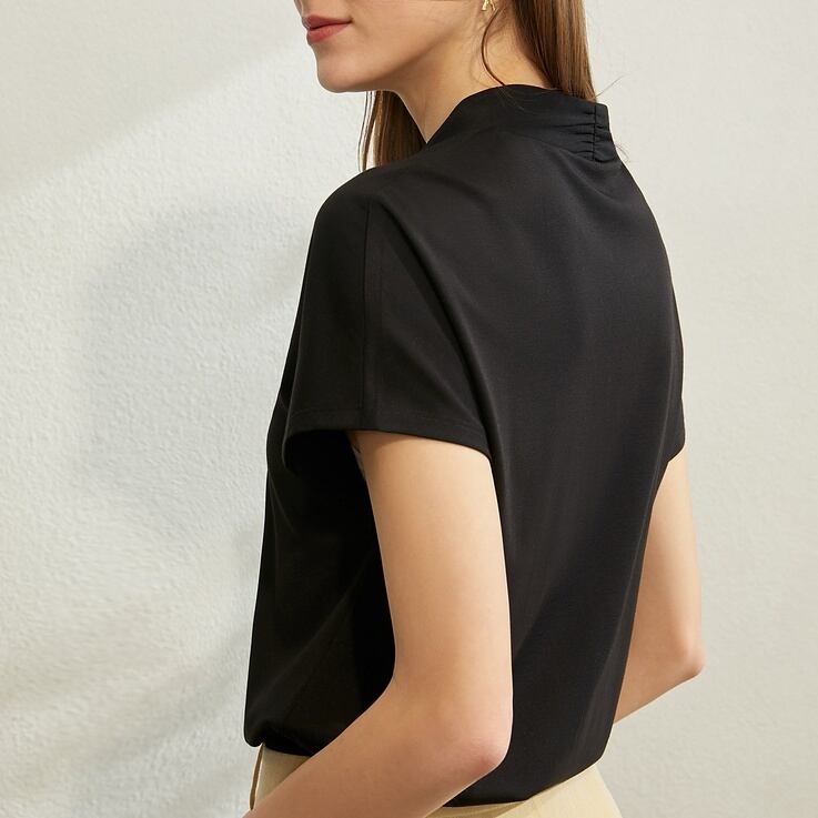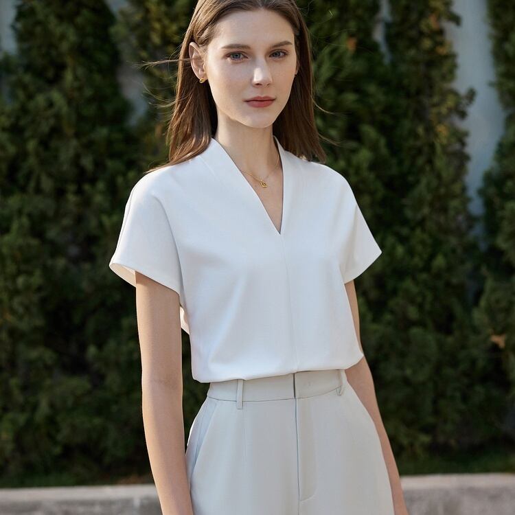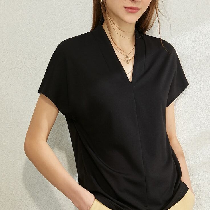 Vネックや襟なしのスタイリッシュなデザインで、大人可愛い雰囲気を演出します。
